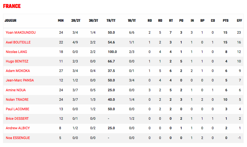 Il y a toutefois eu un bon passage d’Axel Bouteille et le alley-oop entre Hugo Benitez et Jean-Marc Pansa pour conclure le premier acte à +5 pour la France (15-20).