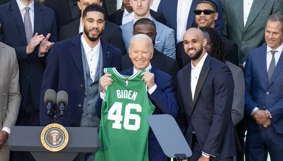 « Les Celtics ne sont pas seulement une équipe de basket. Ils sont un mode de vie », lâche le président, citant l'une des légendes des Celtics Red Auerbach, avant de recevoir un maillot n°46 – son rang historique parmi ceux ayant exercé la fonction suprême américaine – des mains Jayson Tatum et de Derrick White.