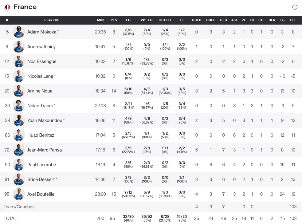 Le meneur de jeu de Saint-Quentin finit ce deuxième match face à Chypre avec 8 points à 2/11 au tir dont 1/5 de loin, 3 passes décisives et 2 interceptions. Il a même raté un dunk en fin de match. Même maladresse pour Noa Essengue, qui se contente de son côté de 2 points à 1/6 au tir, dont 0/3 de loin.