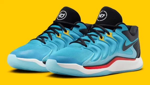 Douze ans plus tard, c’est donc tout naturellement que la KD 17, 17e chaussure signature de Kevin Durant, fait son retour dans la gamme “N7” avec ce coloris principalement bleu turquoise et noir.