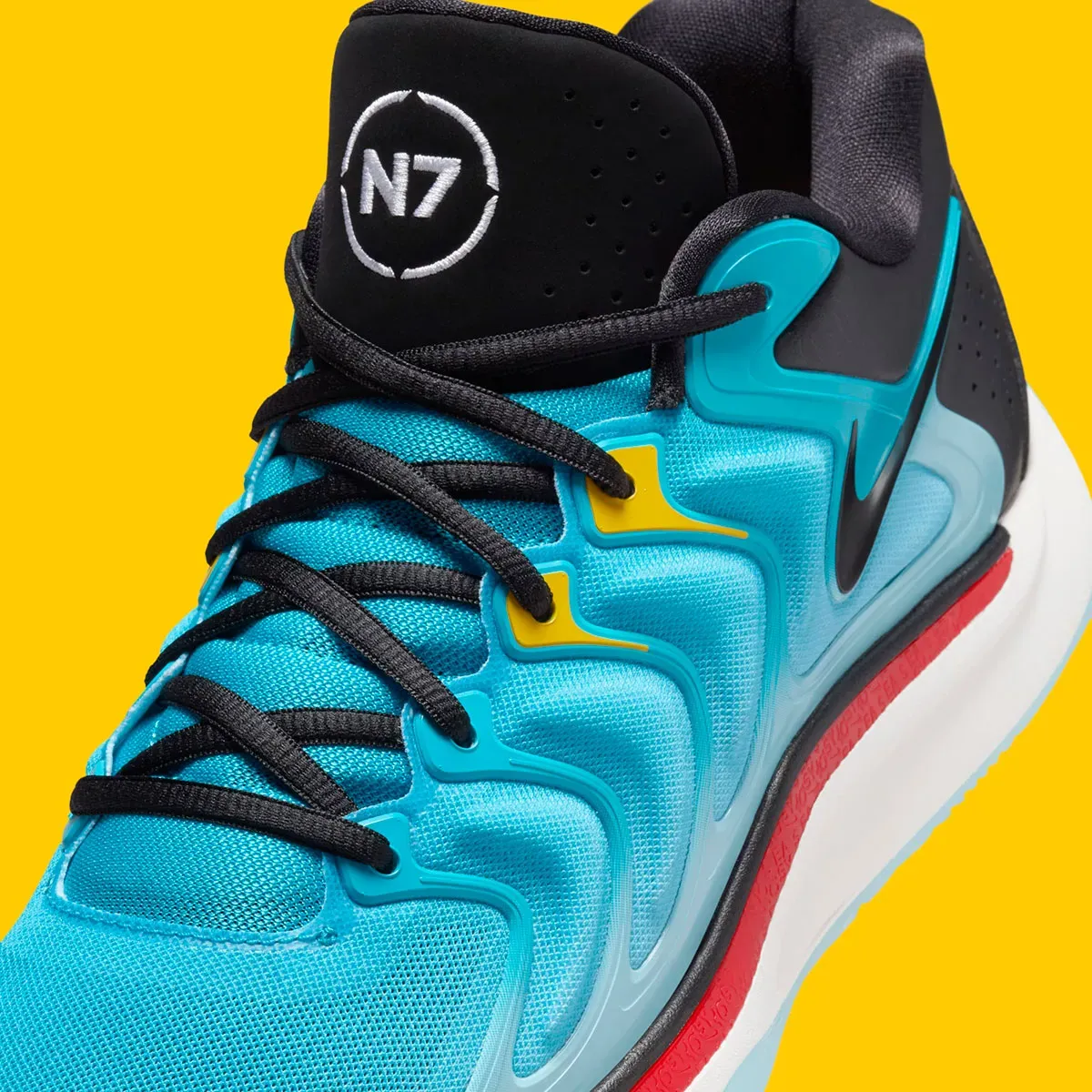 La tige prend un petit côté drapeau des Bahamas avec ses touches de jaune sur quatre de ses dix œillets. Le logo “N7” figure en blanc sur noir sur la languette de la chaussure gauche avec également un motif inédit au niveau du talon. La semelle intermédiaire blanche est assortie d’une bande rouge, tandis que la semelle extérieure apparaît en bleu translucide.