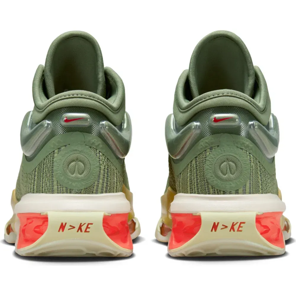 Celui-ci se distingue par une tige vert kaki avec des finitions en orange sur la languette et le talon. Élément fort du modèle avec une mousse Nike React, une unité Zoom Air Strobel sur toute la longueur, et deux grosses unités Zoom Air rondes à l’avant du pied, la semelle ressort quant à elle entre orange, doré et blanc.