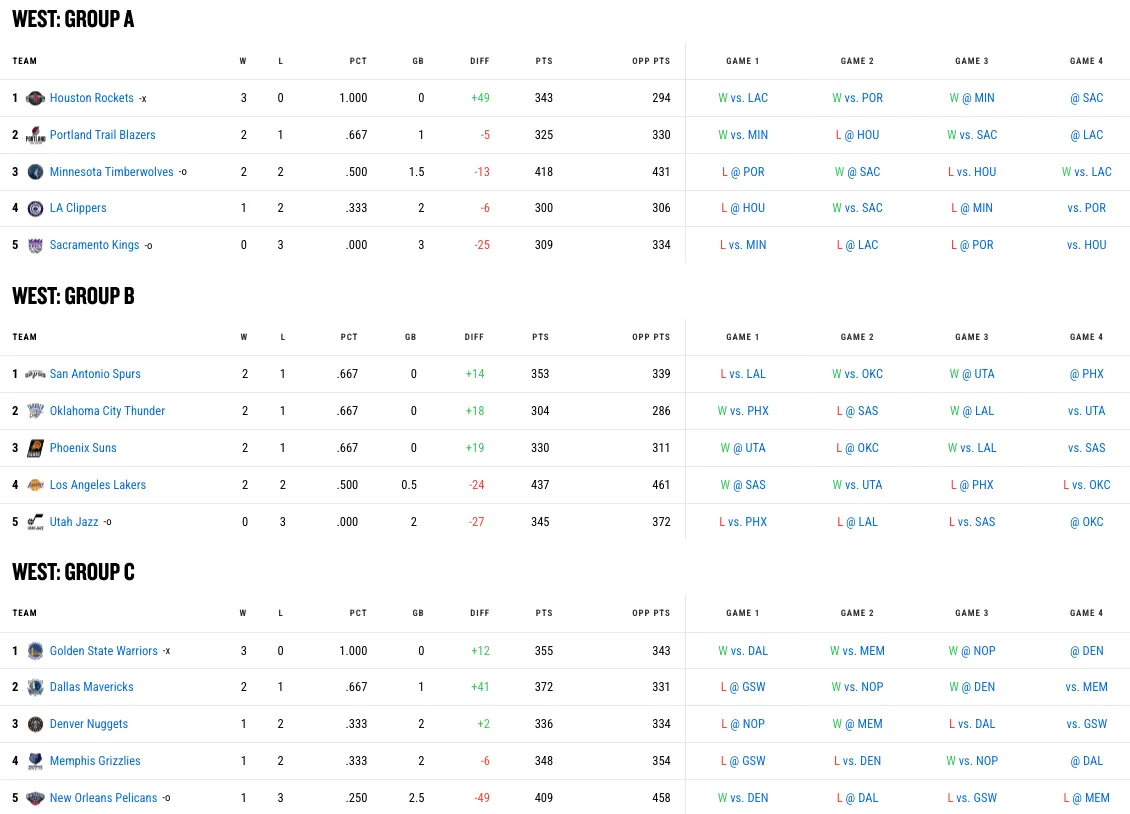 À l'Ouest, on connaissait ainsi déjà deux des quatre qualifiés pour les quarts de finale puisque les Warriors et les Rockets sont assurés de finir en tête de leurs groupes, avec leurs trois victoires en trois matchs.