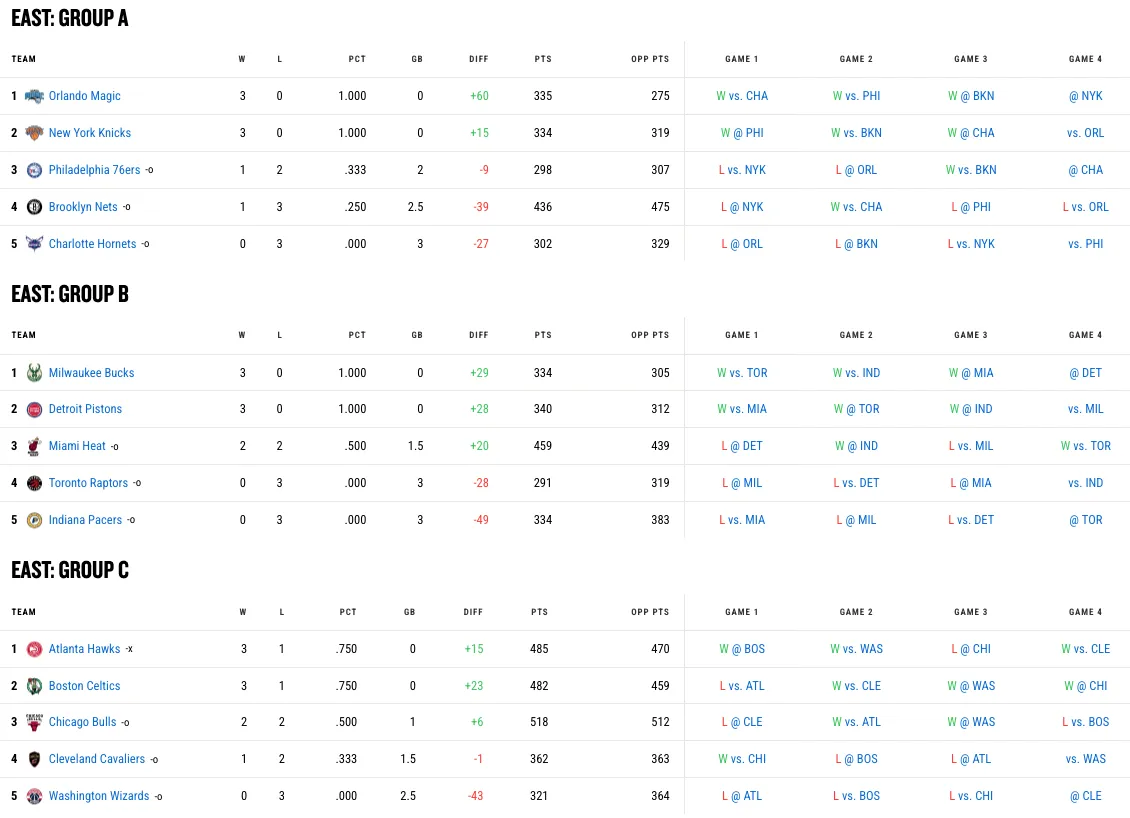 Depuis cette nuit, on connait le premier qualifié à l'Est, les Hawks ayant validé leur place pour la phase éliminatoire de la compétition en remportant leur groupe, suite à leur succès face aux Cavaliers.