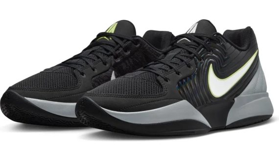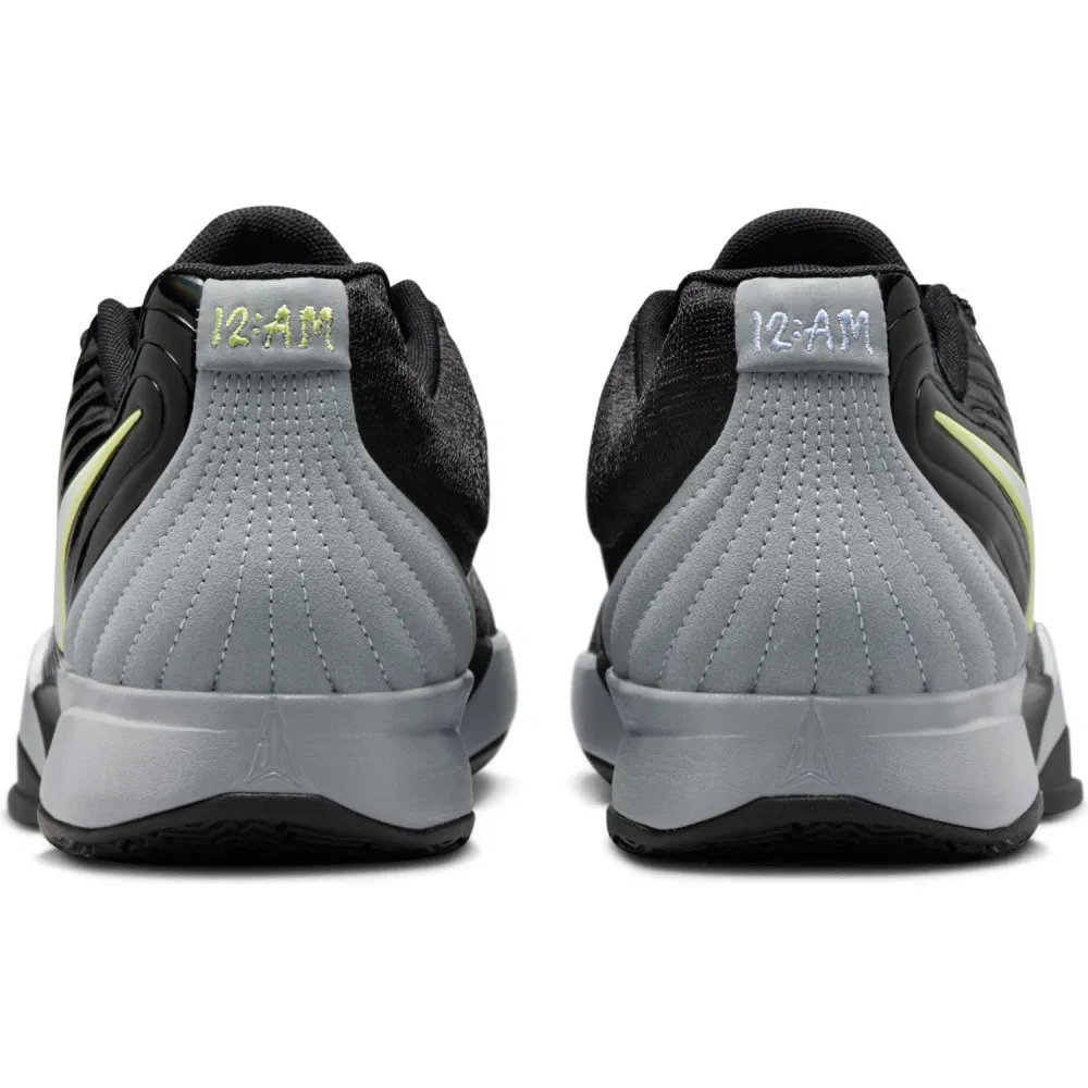 Le reste de la tige est en mesh, avec une superposition en gris au niveau du talon, sur lequel on retrouve également le “12.AM” figurant en gris et vert clair. Le logo du joueur ressort aussi en gris (sur la chaussure gauche) et vert clair (sur la droite) sur la languette. L’ensemble repose sur une semelle en gris et noir.