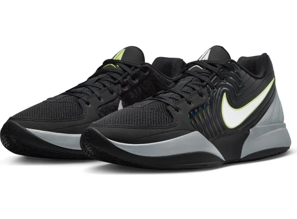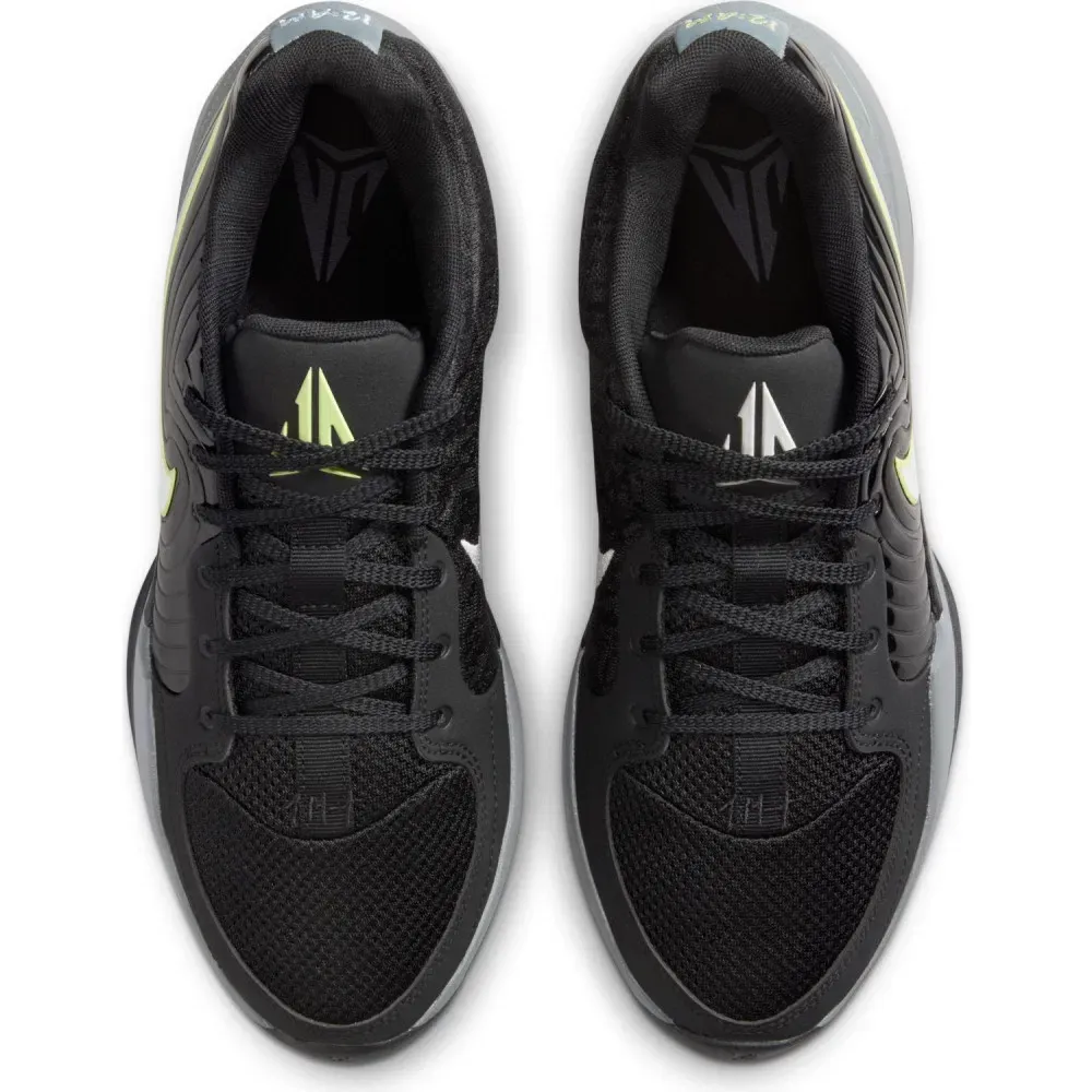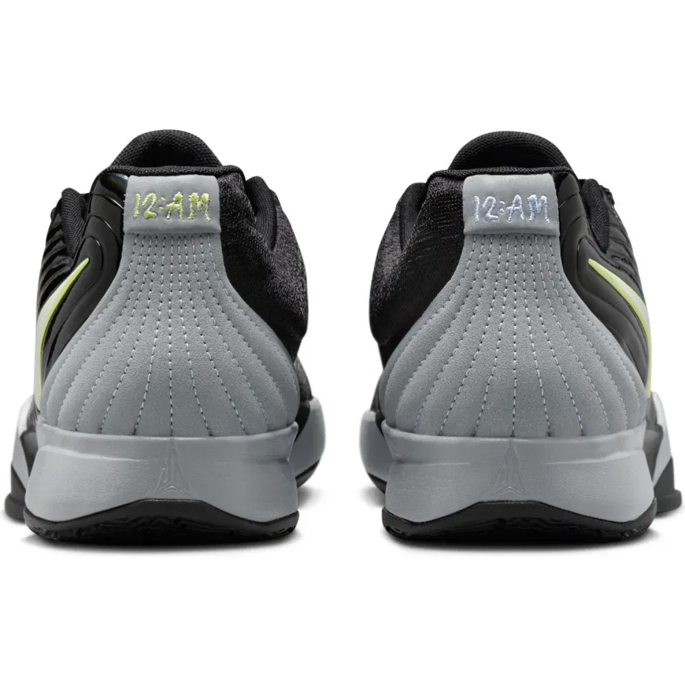 Le reste de la tige est en mesh, avec une superposition en gris au niveau du talon, sur lequel on retrouve également le “12.AM” figurant en gris et vert clair. Le logo du joueur ressort aussi en gris (sur la chaussure gauche) et vert clair (sur la droite) sur la languette. L'ensemble repose sur une semelle en gris et noir.