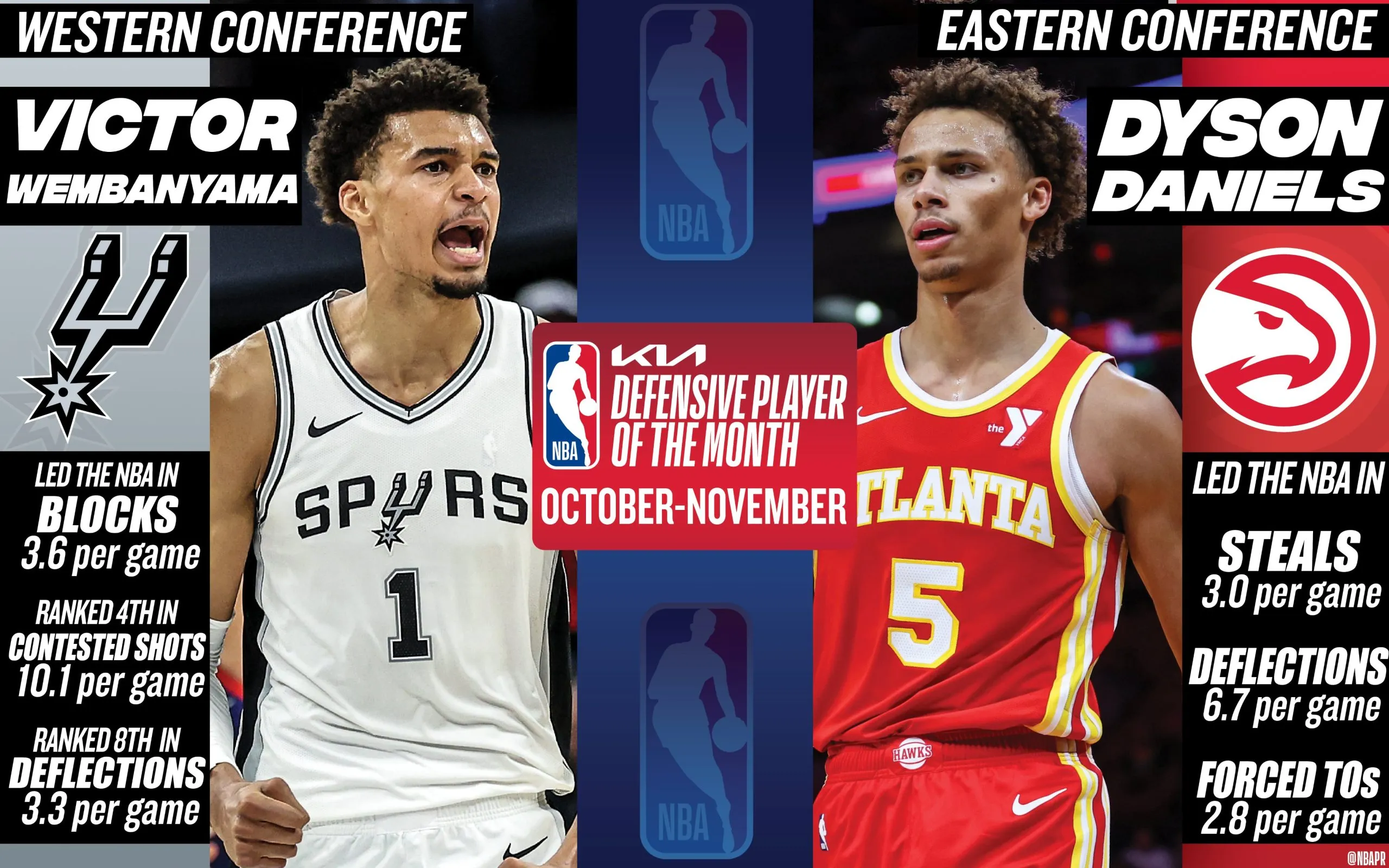 Pour justifier ces choix, la NBA met en avant le fait que Victor Wembanyama est le meilleur contreur de la ligue (3.6 blocks par match), qu’il est quatrième au niveau des tirs contestés par match (10.1) et huitième au niveau des ballons déviés (3.3). Dyson Daniels est lui le meilleur intercepteur (3.0 steals par match) de la ligue et le joueur qui dévie le plus de ballons (6.7) mais également celui qui force le plus de ballons perdus chez l’adversaire (2.7).