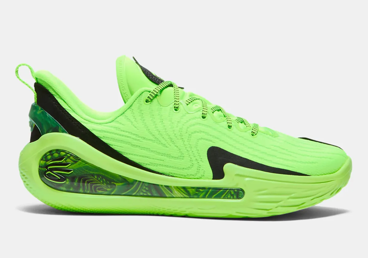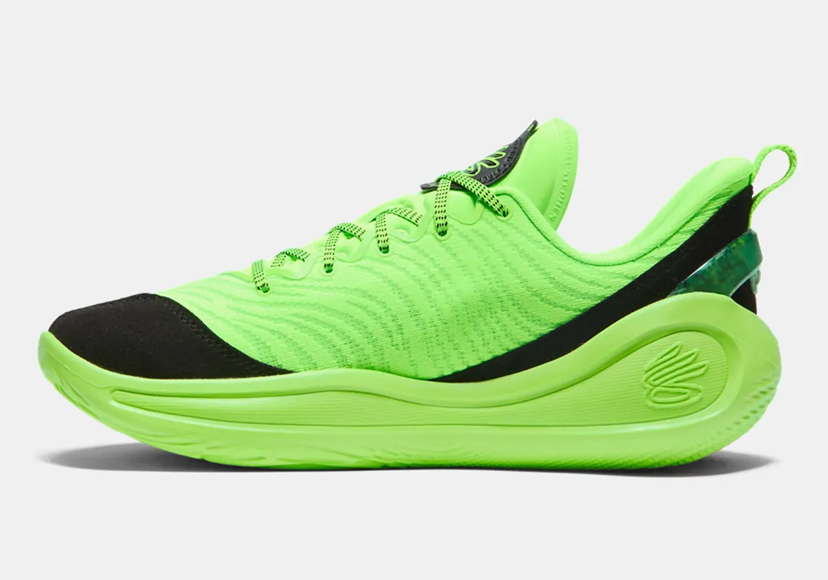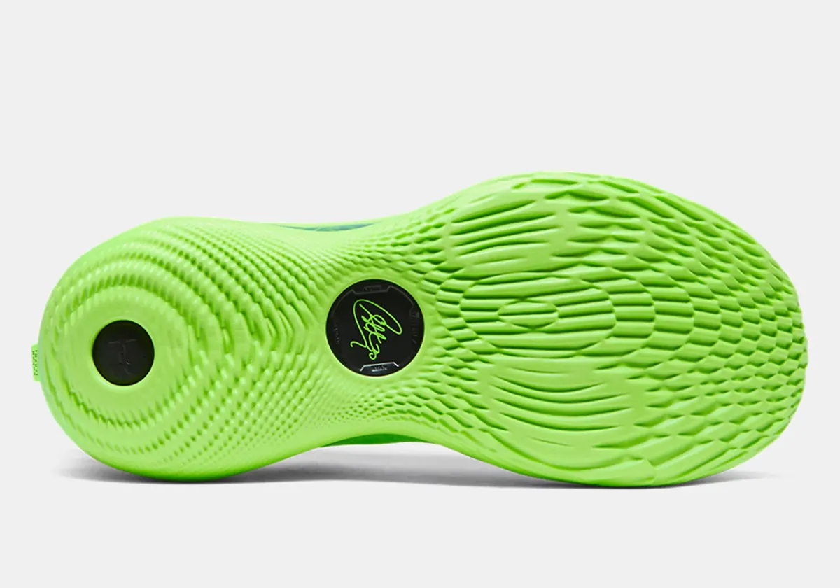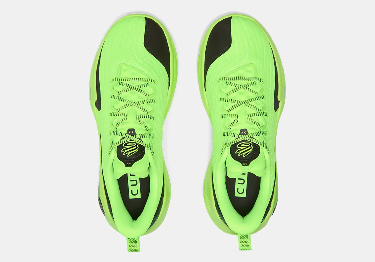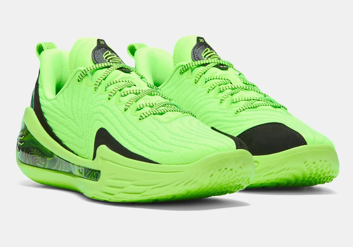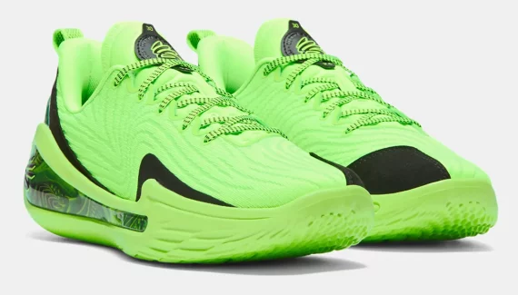 Under Armour a ici osé le vert fluo pour habiller la tige complétée par une base en noir. Le logo de Stephen Curry ressort en vert sur noir sur la languette. Un renfort en TPU au niveau du talon apparaît en vert foncé, tandis qu’un motif noir et vert complètement également la semelle intermédiaire.