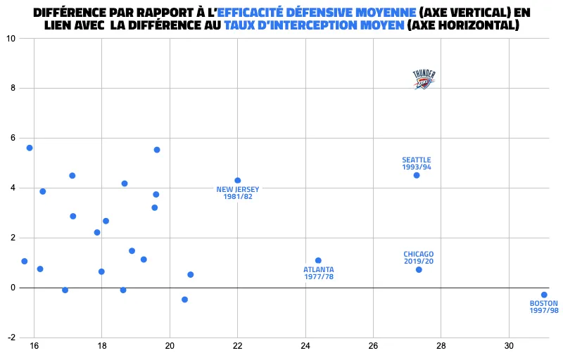 La différence de l’efficacité défensive (+8.4) de ce Thunder par rapport à la moyenne est ainsi exceptionnelle.