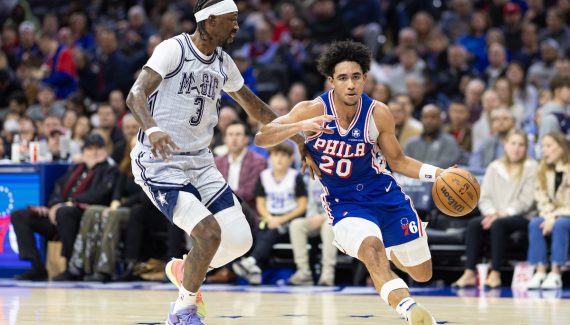Comme remplaçant, Jared McCain joue quasiment moitié moins, et sa moyenne de points chute logiquement de moitié. Pas son pourcentage d’adresse (11 points à 46%). Son adresse longue-distance (38% sur l’année) reste constante, ce qui n’est pas inintéressant pour créer des espaces auprès des trois vedettes évoquées plus haut, pour le moment hyper maladroites de loin (31% pour Paul George, 29% pour Tyrese Maxey et 13% pour Joel Embiid…).