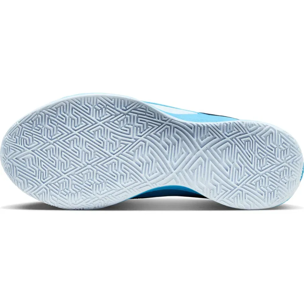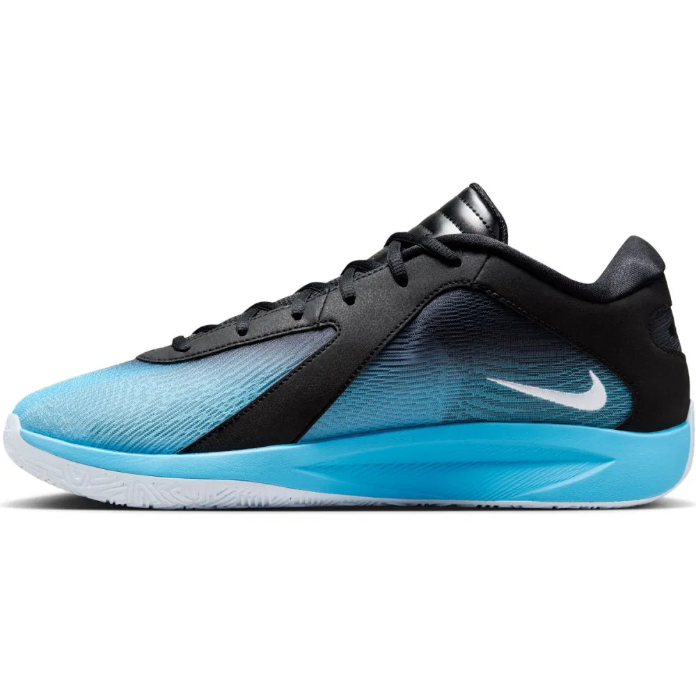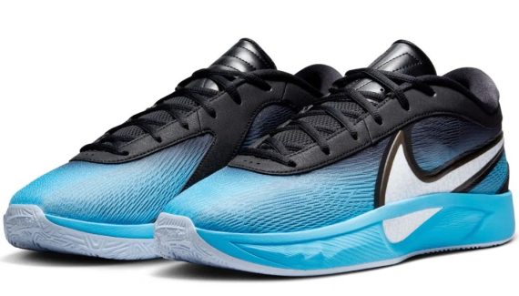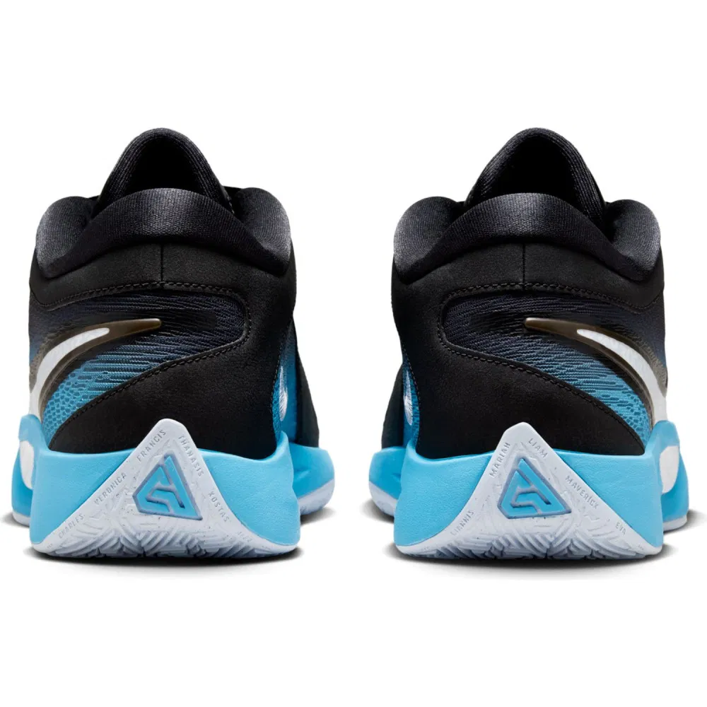 La 6e chaussure signature de Giannis reste loin des coloris clichés en rouge et vert en optant pour une tige en noir et bleu ciel pour illustrer la fraîcheur hivernale avec des finitions en blanc, afin de faire ressortir le « Swoosh » notamment. La semelle extérieure est également blanche, comme pour se confondre avec la neige.
