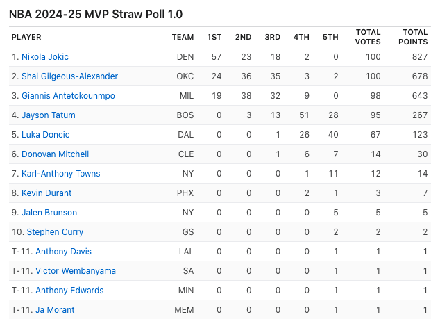ESPN a effectué son premier pointage, auprès de 100 journalistes, sur la course au MVP pour cette saison 2024/25. Et trois joueurs font la course en tête : Nikola Jokic, Shai Gilgeous-Alexander et Giannis Antetokounmpo.