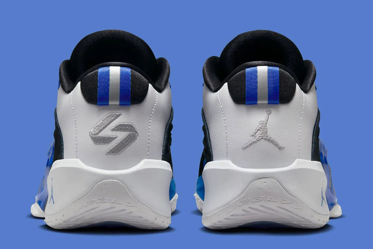 Si la tige en noir et blanc reste sur le thème principal du sport automobile développé sur cette troisième chaussure signature, avec notamment une zone à damiers, on distingue deux tons bleu similaires à ceux de la franchise texane, sur l’Isoplate, les œillets en TPU et pour faire ressortir le “Jumpman” sur la languette.