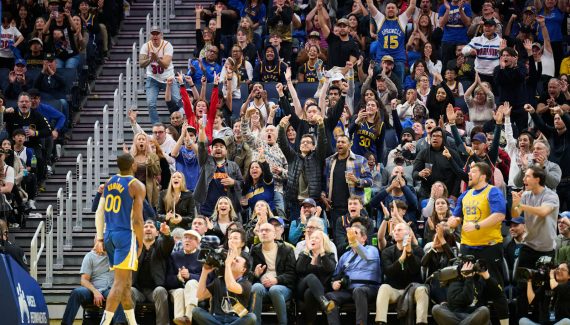 – Le tour de magie de Stephen Curry pour battre le buzzer de la mi-temps. Alors qu’il restait six secondes au chrono de la première mi-temps après deux points de Kevin Durant, Stephen Curry a remonté tout le terrain, avant d’arrêter son dribble à la ligne de 3-points pour faire passer la balle autour de lui afin d’éviter Okogie, Durant et Jones, et balancer un floater qui est rentré au buzzer !