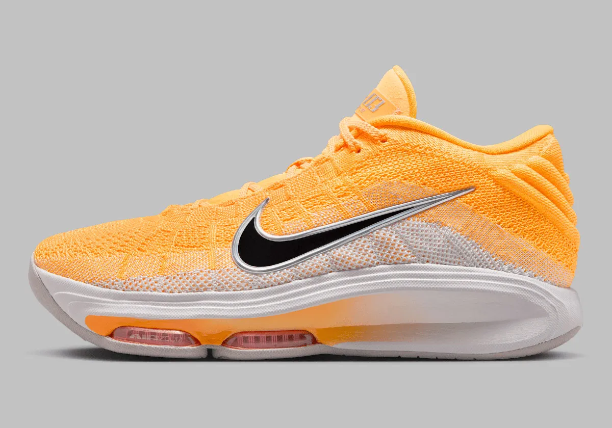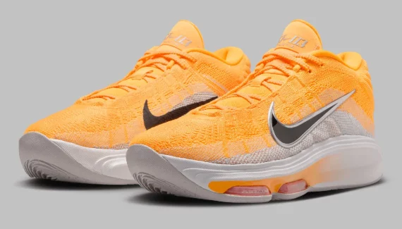 Le modèle de “Wemby” connaît un regain d’attention ces dernières semaines avec encore un nouveau coloris « Laser Orange » qui devrait animer le début d’année 2025. L’empeigne « tricotée » en Flyknit apparaît en orange avec une base blanc-gris. Le « Swoosh » ressort pour sa part en noir aux contours « gris métal » d’un côté. La semelle apparaît également en blanc-gris. Les inscriptions présentent sur la languette et le « GT » sur le talon sont aussi en gris.