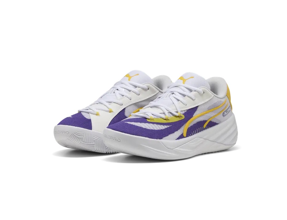 La Puma All-Pro Nitro est l’un des modèles les plus productifs depuis sa sortie il y a un an et demi. Mais parmi la vingtaine de coloris déjà parus, aucune franchise NBA n’avait été mise à l’honneur. C’est désormais chose faite avec cette version « Team LA » qui reprend les couleurs des Lakers de Los Angeles.