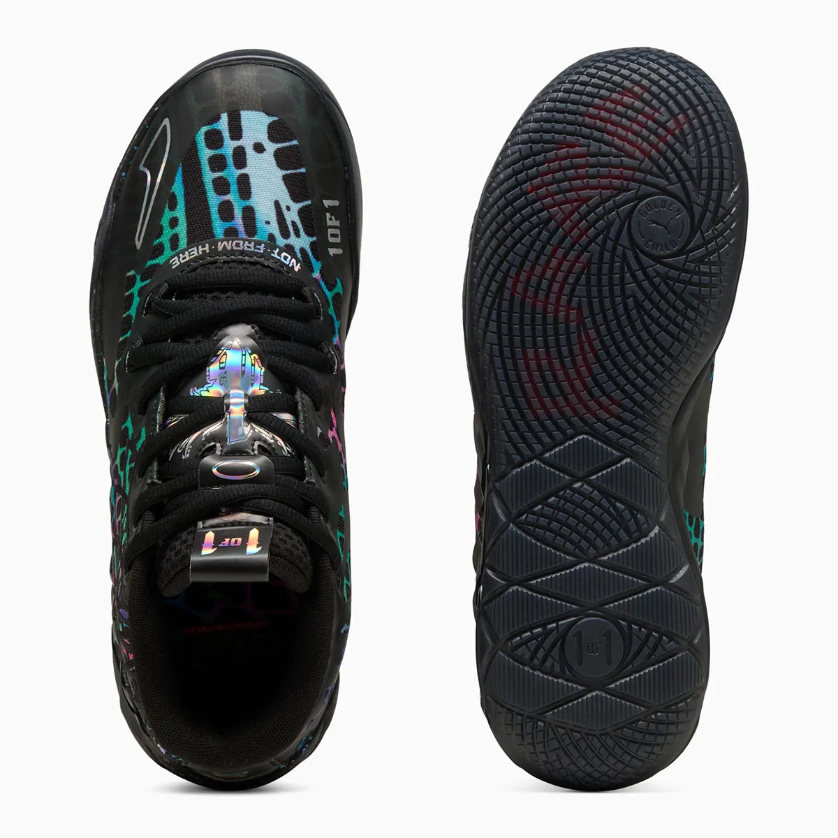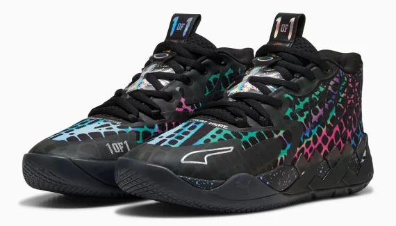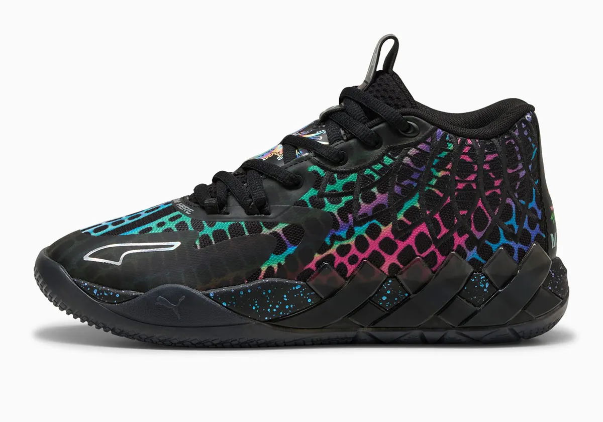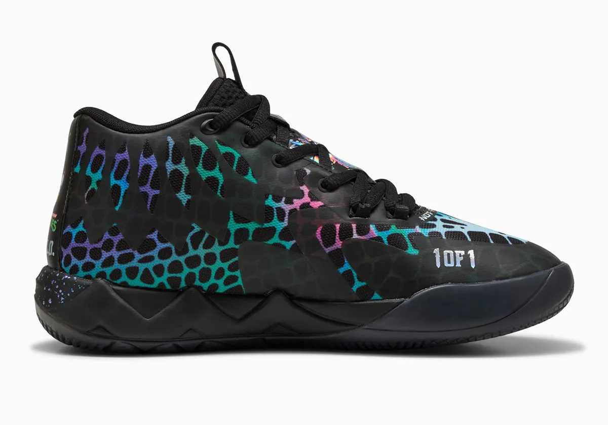 Baptisé « Baxter Stockman » du nom d’un des personnages de la série, celui ci se présente en noir avec un motif de toile multicolore et brillant. Aux logos Melo et Puma s’ajoutent un imprimé du visage de Baxter Stockman et le logo Tortues Ninja au niveau du talon. L’ensemble repose sur une semelle noire, tachetée sur la partie intermédiaire.