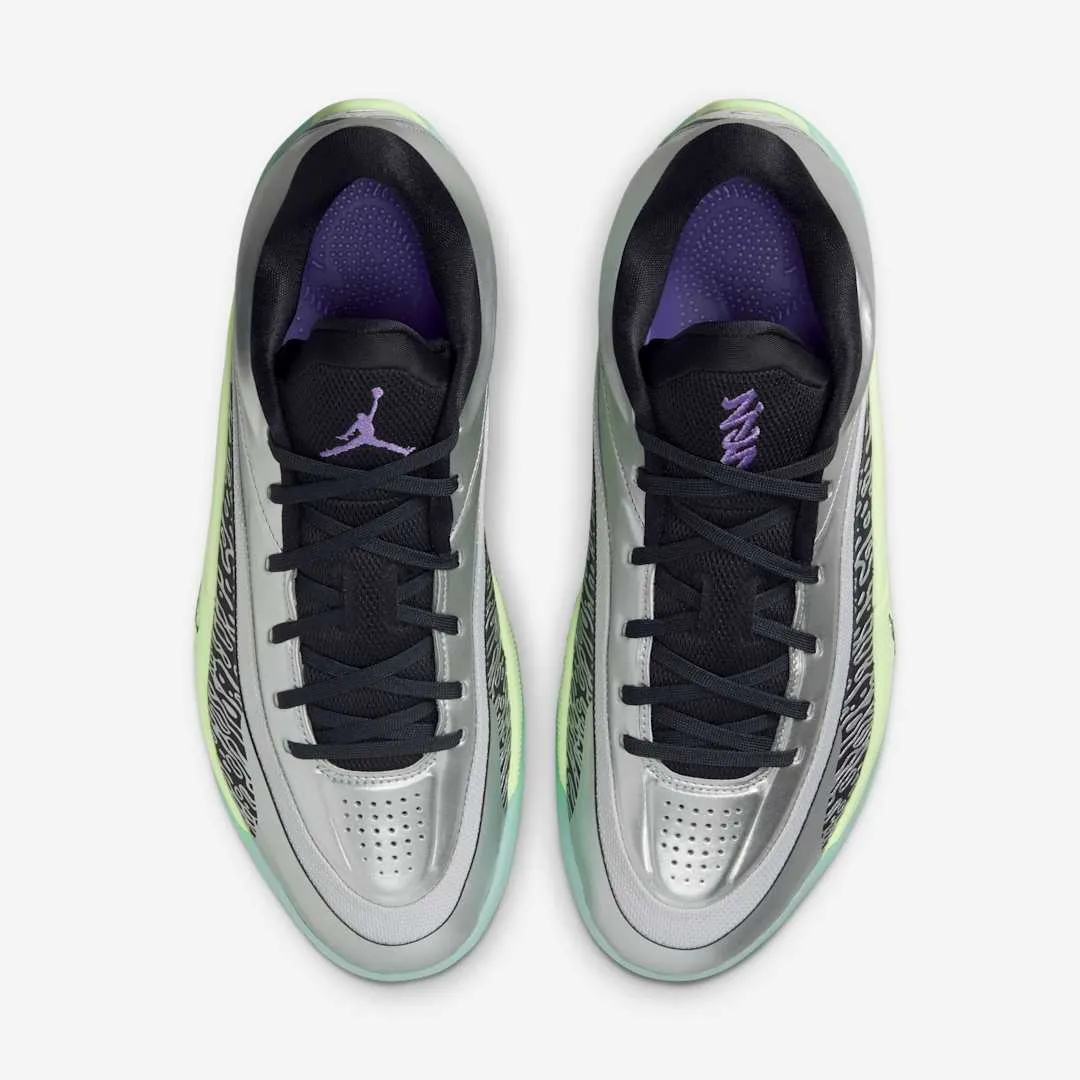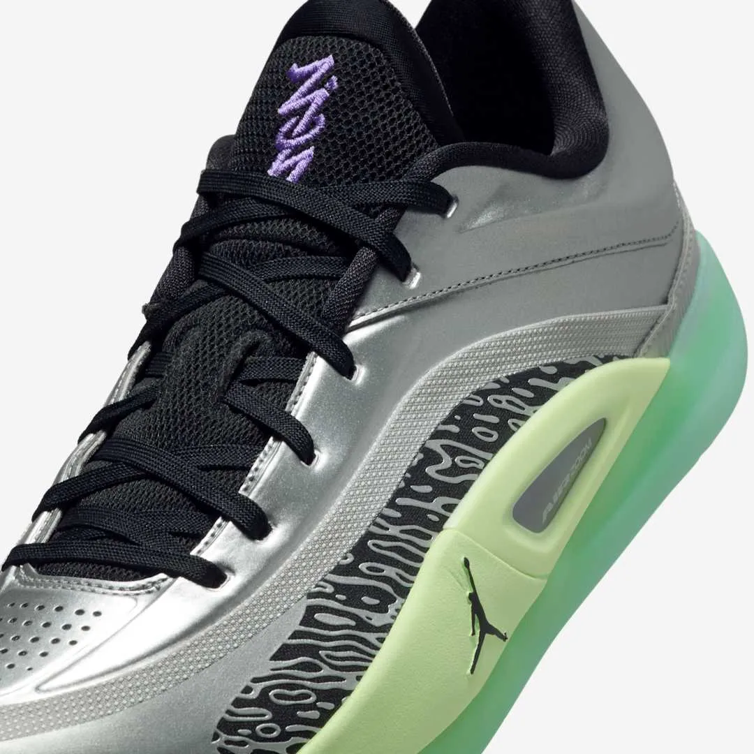 Pour ce qui est des coloris, Jordan Brand en a déjà dévoilé trois. La Zion 4 « Damascus Steel » en gris, noir et vert phosphorescent avec des finitions en violet, est attendue pour le 28 janvier ! Suivront ensuite les versions « Mud to Marble » (11 février) et « Forged in Fire » (11 mars) pour compléter le lancement de la paire. En espérant que Zion Williamson sera revenu sur les terrains pour en assurer la promotion d'ici là ! Son prix est annoncé à 140 dollars. En attendant, voici donc les premiers clichés de la Zion 4 Damascus Steel.