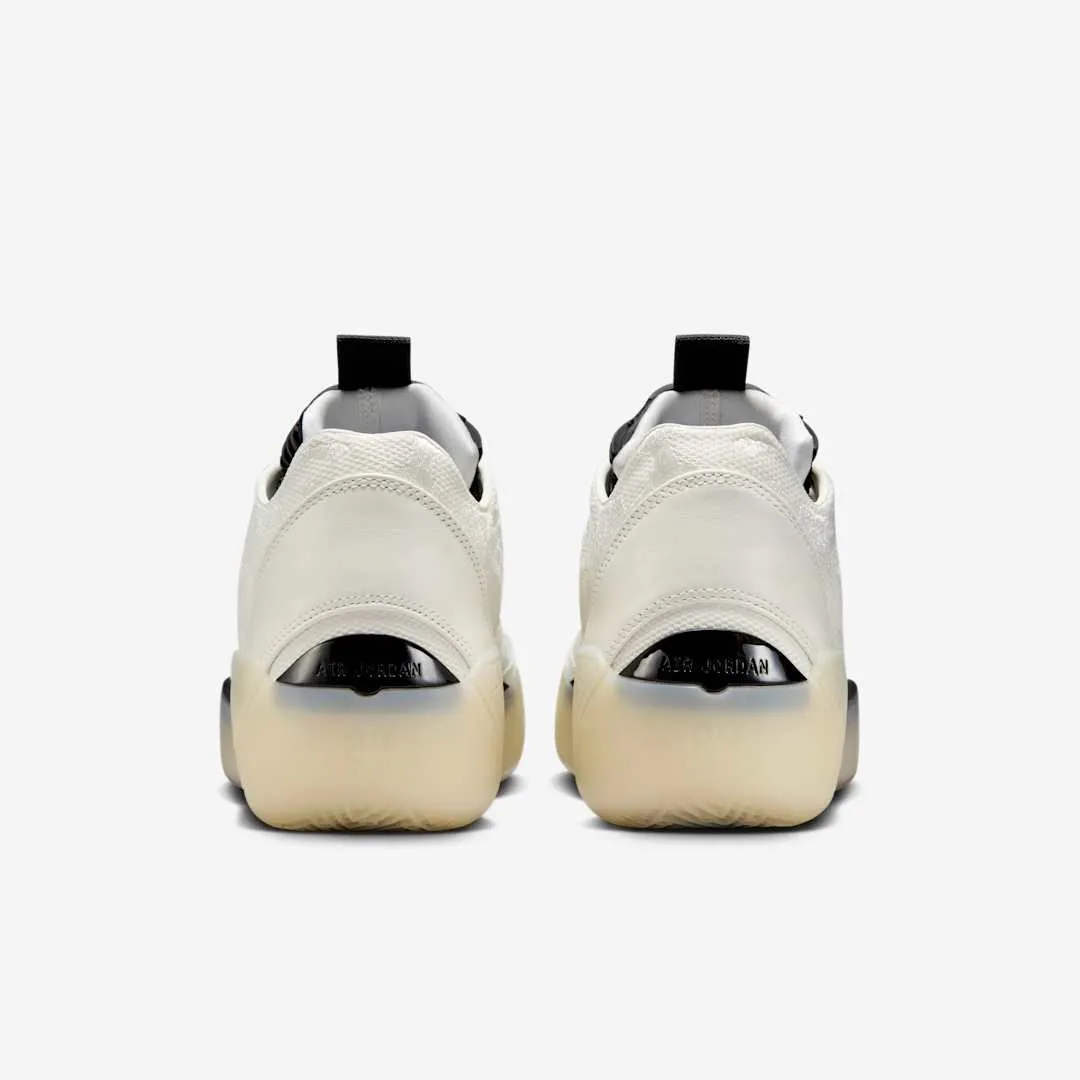 La tige est principalement blanche, avec du noir sur la languette et les bases des parties latérales, avant, et du talon. Le logo « Jumpman » ressort en bleu sur la languette.