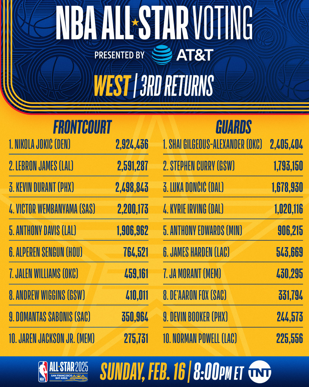 Sur le “frontcourt”, c’est Nikola Jokic (Nuggets) qui domine toujours le classement dans la conférence, devant LeBron James (Lakers) alors que Kevin Durant (Suns) descend à la troisième place. L’ailier de Phoenix perd même du terrain sur Victor Wembanyama (Spurs), toujours quatrième, mais désormais à moins de 300 000 voix. Même si ce sera difficile à combler en seulement quelques jours…