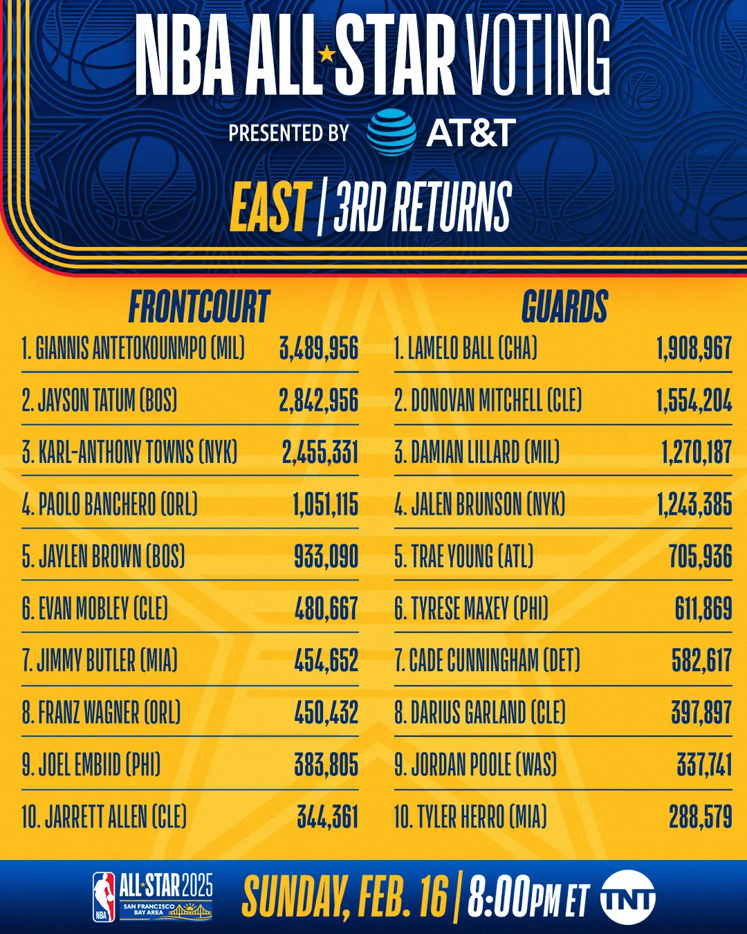 À l’Est, Giannis Antetokounmpo (Bucks) est toujours largement en tête des votes des fans, devant Jayson Tatum (Celtics) et Karl-Anthony Towns (Knicks). Sur le « backcourt », c’est encore LaMelo Ball (Hornets) qui est assez nettement en tête, devant Donovan Mitchell (Cavaliers).