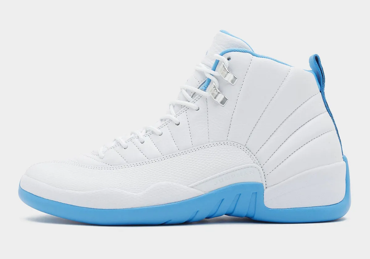 Cette Jordan 12 est quasi identique à sa version « UNC » aux couleurs de l’université de Michael Jordan, avec une tige en cuir blanc assortie de finitions en bleu ciel. Le « Jumpman » ressort en bleu clair sur la languette et en blanc sous la languette.
