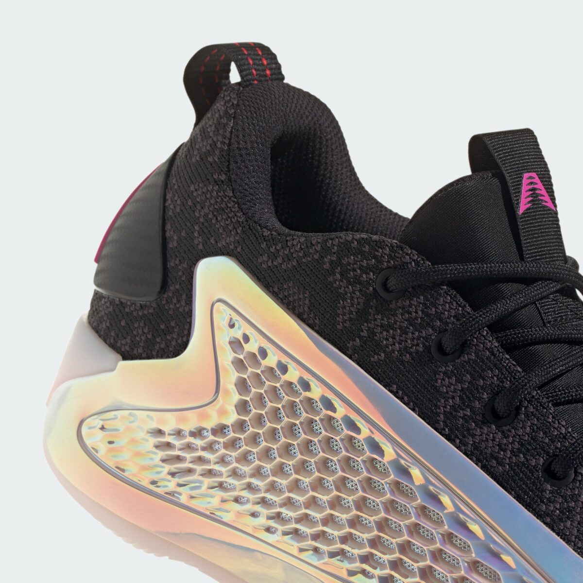 Dans sa version Low, la paire se présente avec une partie en mesh similaire à de la peau de serpent entre noir et marron, tandis que les parois latérales en TPU ressortent dans un coloris aux reflets iridescents La semelle ressort en blanc et rose. On retrouve également du rose sur les logos adidas et du joueur, respectivement sur le talon et la languette.