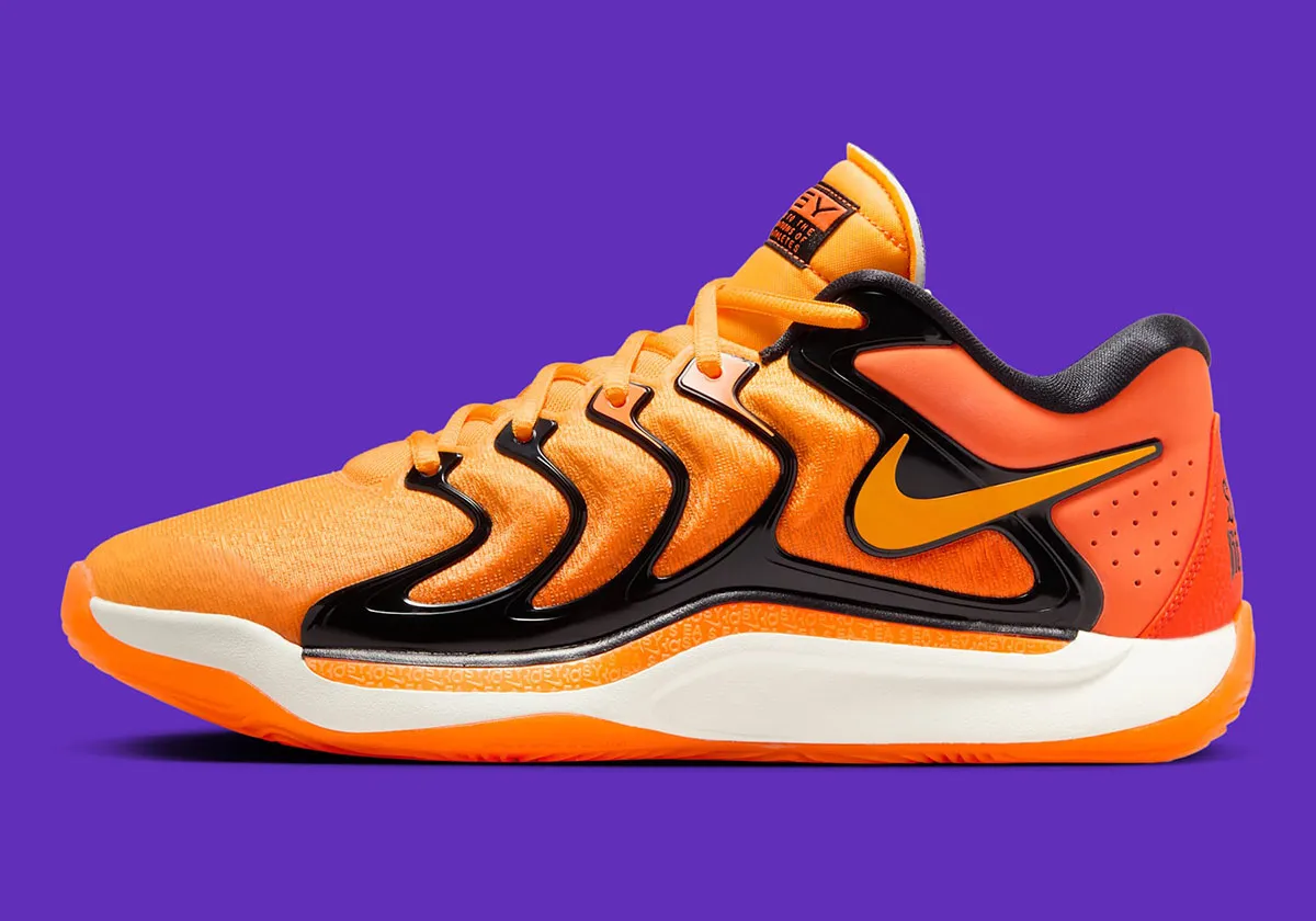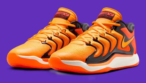 Après la récente KD 17 « Easy Money », c’est un autre surnom de la superstar des Suns qui va connaître son heure de gloire avec cette version « Slim Reaper ». Le coloris avait initialement été dévoilé peu avant Halloween en octobre dernier, et il faut dire que le thème aurait parfaitement collé avec sa tige en orange et noir assortie d’une simple bande blanche au niveau de la semelle intermédiaire.