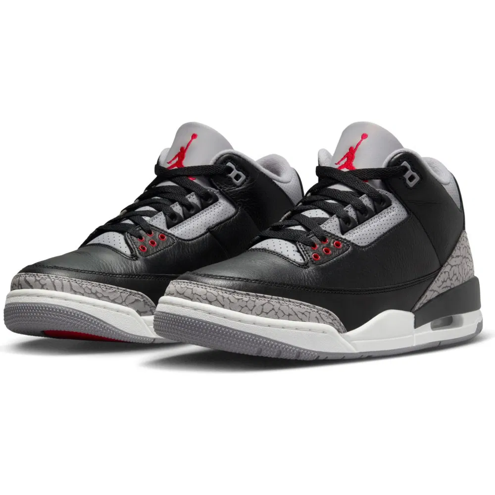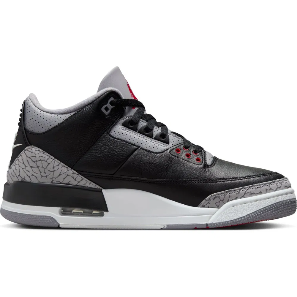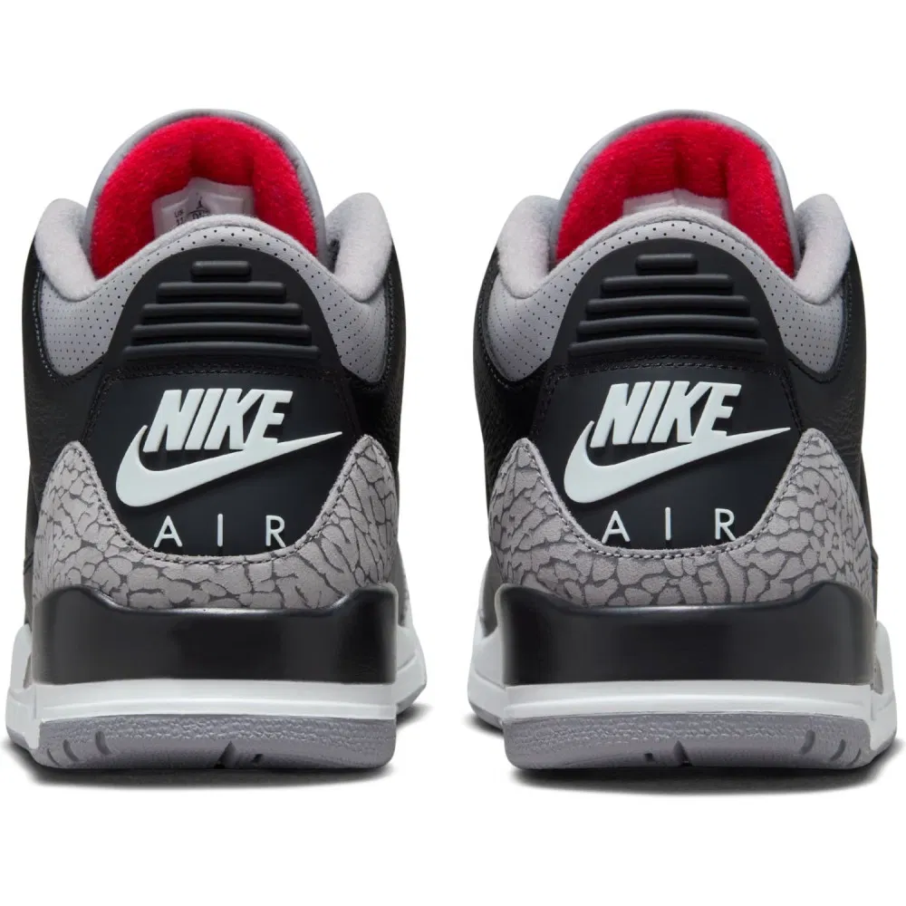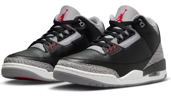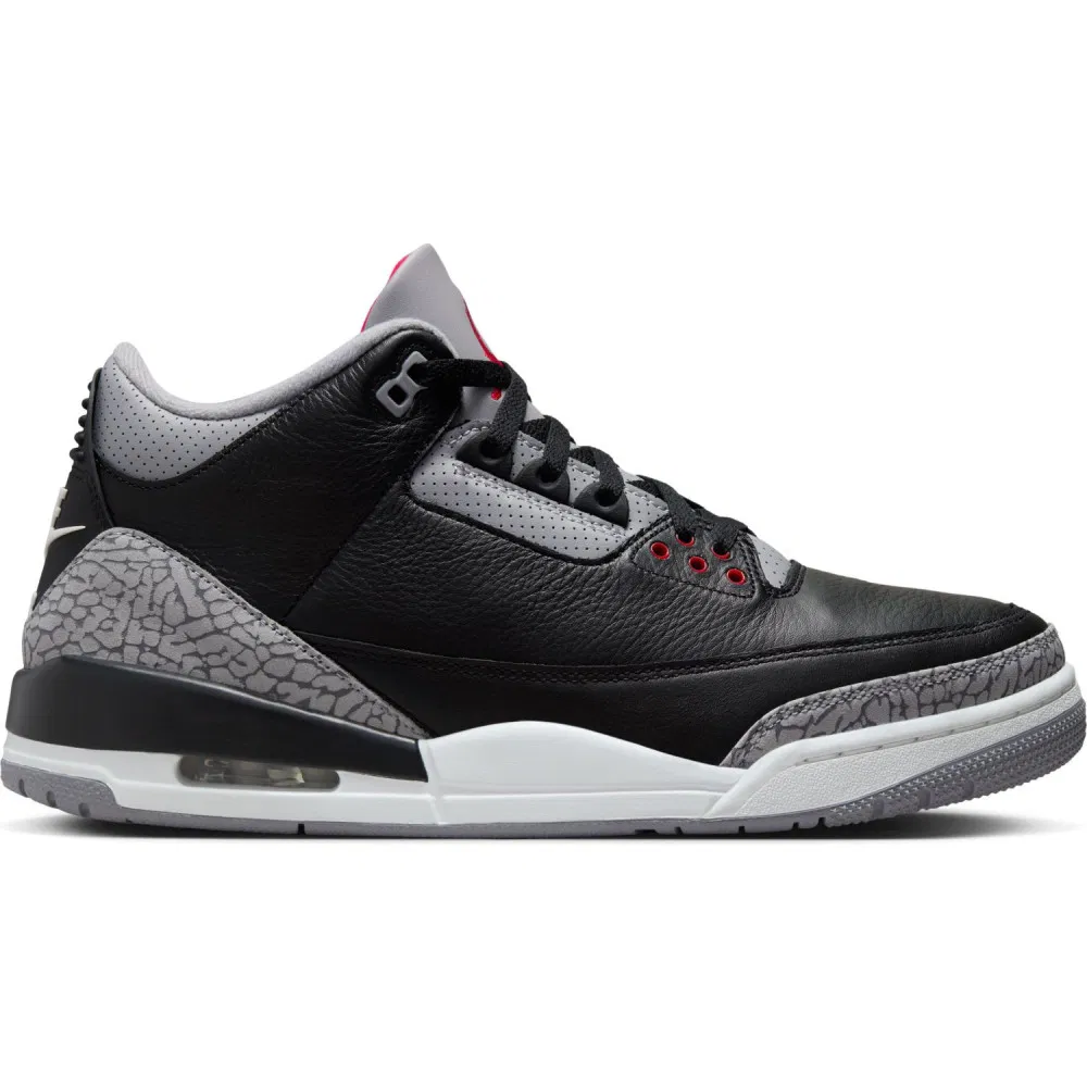 Les amateurs de la Air Jordan 3 qui n’ont pas été assez vifs pourront toutefois se rabattre sur la version rétro “Black Cement” qui est toujours disponible en France. Sa tige entre cuir véritable noir et cuir synthétique est assortie du traditionnel imprimé éléphant à sa base. L’ensemble est complété de finitions en rouge, pour faire ressortir le “Jumpman” sur la languette grise, tandis que le “Nike Air” apparaît en blanc sur noir au niveau du talon. La semelle intermédiaire blanche en mousse contient une unité Air-Sole au talon et à l’avant-pied pour garantir un bon amorti. L’ensemble repose sur une semelle extérieure en caoutchouc gris.