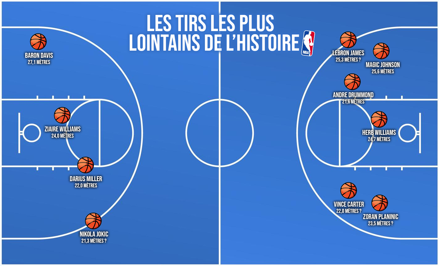- 1) Baron Davis : 27,1 mètres avec les Hornets, le 17/02/2001 contre les Bucks