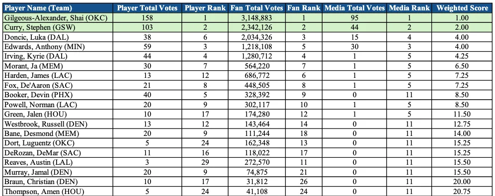 Unanimité également sur le “backcourt” de l'Ouest puisque Shai Gilgeous-Alexander et Stephen Curry ont fini aux deux premières places chez les fans, les journalistes et les fans.