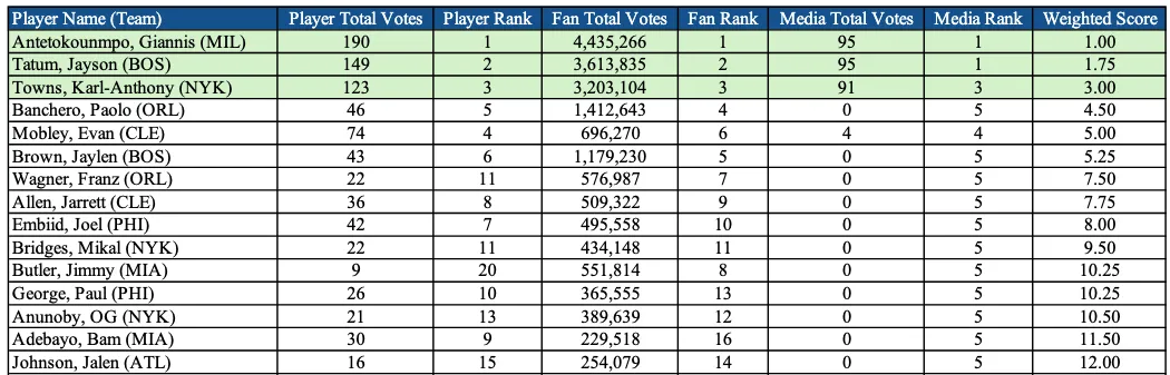 À l'Est, le “frontcourt” des titulaires faisait l'unanimité puisque Giannis Antetokounmpo, Jayson Tatum et Karl-Anthony Towns ont fini aux trois premières places dans les trois panels.