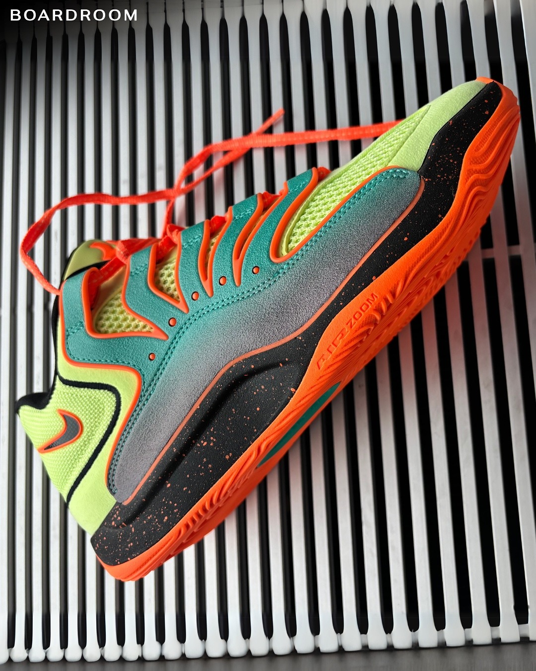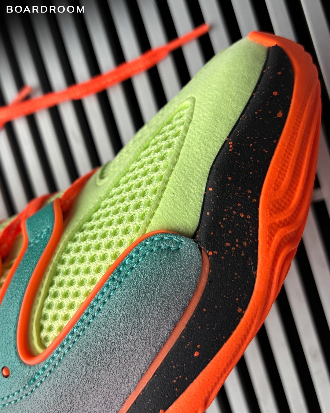 Pour ce premier coloris « Liquid Lime », on retrouve une base de vert clair « Lime » assortie d’orange et de noir. Les renforts latéraux ressortent dans un dégradé autour du vert émeraude pour compléter le tout, avec également une semelle intermédiaire en noir tacheté d’orange.