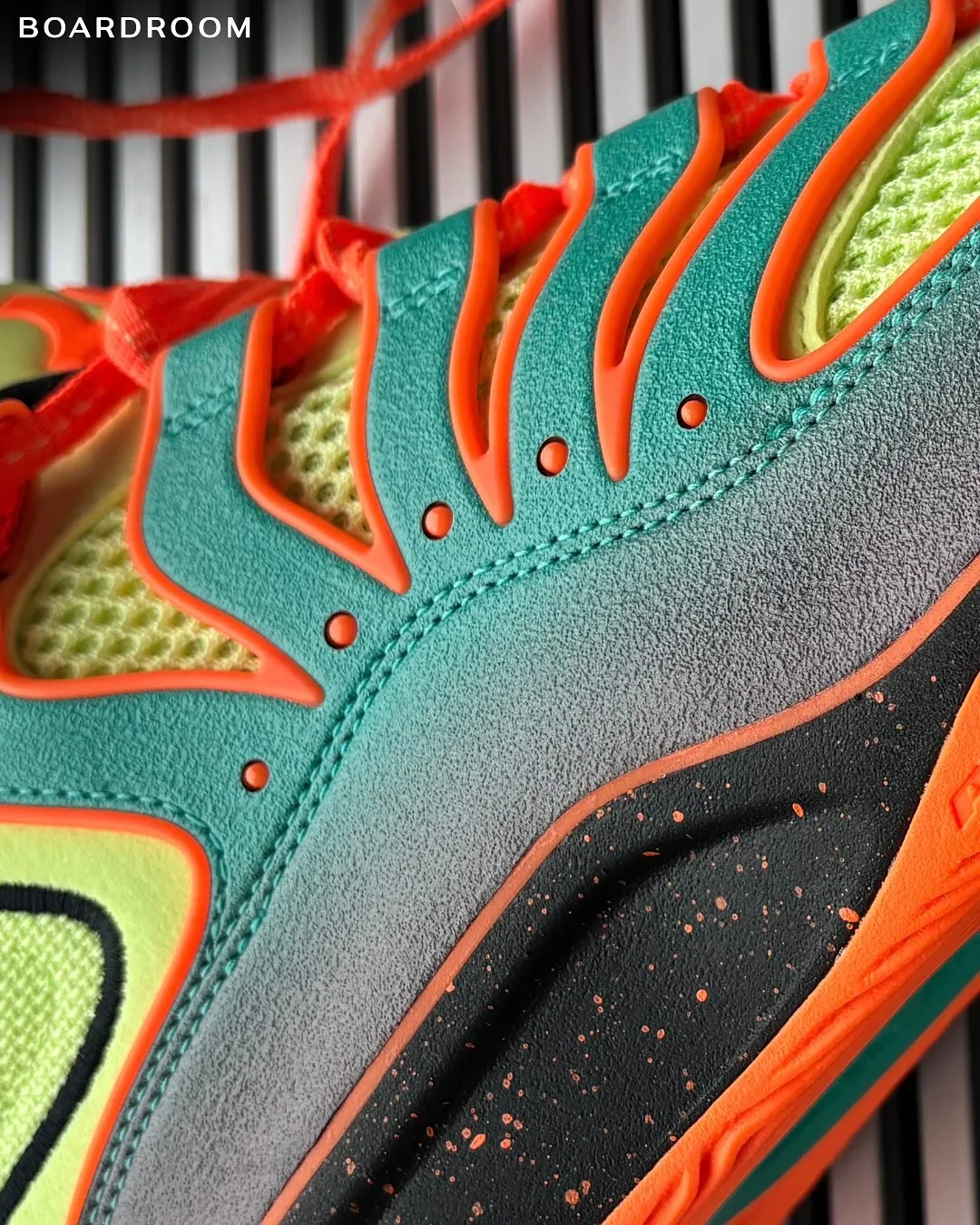 Pour ce premier coloris « Liquid Lime », on retrouve une base de vert clair « Lime » assortie d'orange et de noir. Les renforts latéraux ressortent dans un dégradé autour du vert émeraude pour compléter le tout, avec également une semelle intermédiaire en noir tacheté d'orange.