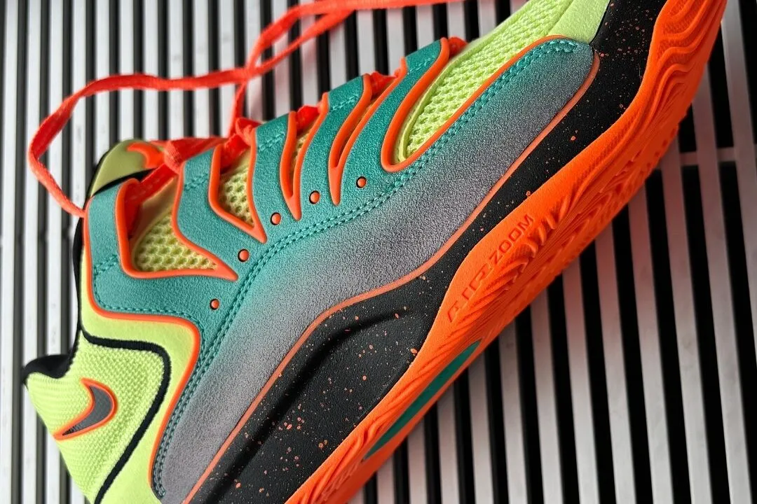 Malgré le succès de la KD 17, Nike a su innover tout en préservant une certaine base, comme des renforts latéraux toujours présents, ici sous formes de « lanières », mais avec une base en mesh qui paraît plus aérée, tandis que la virgule est reléguée au niveau du talon.