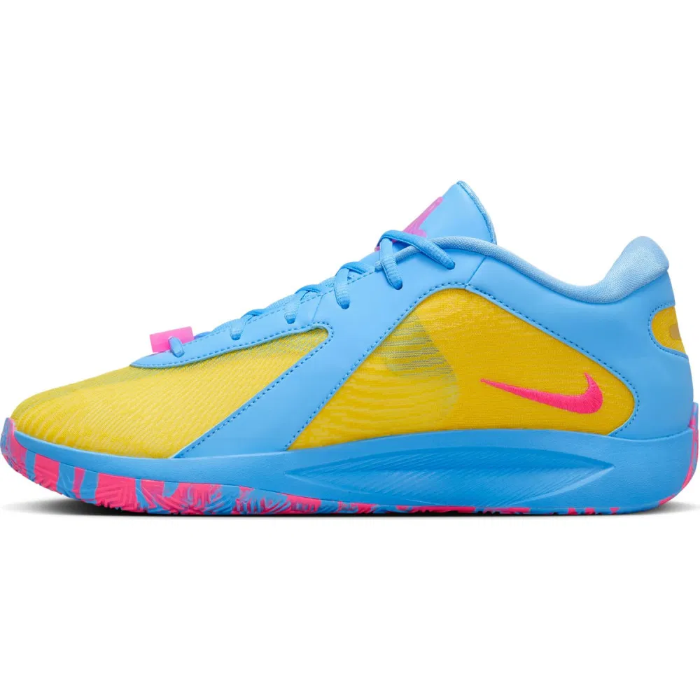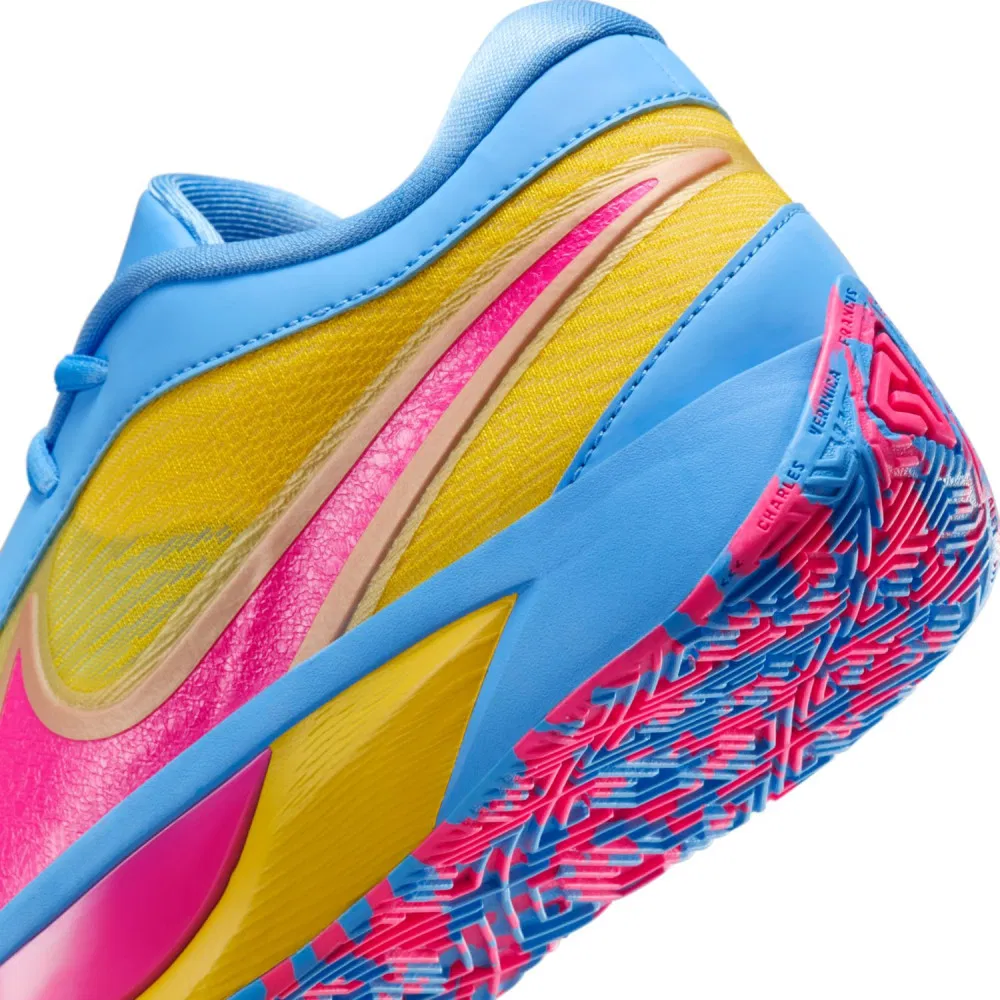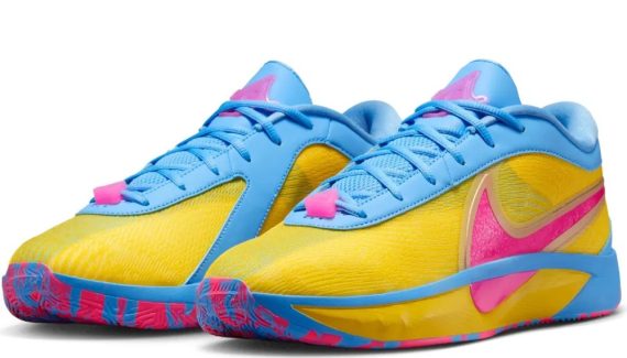 La sortie de ce nouveau coloris de la Giannis Freak 6 est l’occasion de lui faire un petit coup de pub. Baptisé « Candy Funhouse », il offre une tige aux couleurs des sucreries dont raffolent le « Greak Freak », avec un ensemble en bleu et jaune complété par des touches de rose bonbon de circonstance, pour faire ressortir le « Swoosh » sur l’empeigne, ou le logo du joueur sur la languette.