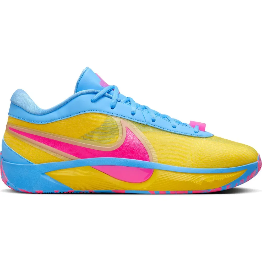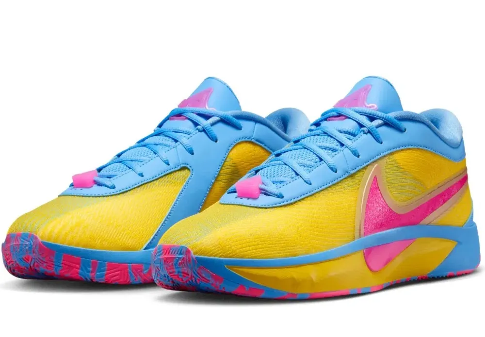 La sortie de ce nouveau coloris de la Giannis Freak 6 est l'occasion de lui faire un petit coup de pub. Baptisé « Candy Funhouse », il offre une tige aux couleurs des sucreries dont raffolent le « Greak Freak », avec un ensemble en bleu et jaune complété par des touches de rose bonbon de circonstance, pour faire ressortir le « Swoosh » sur l'empeigne, ou le logo du joueur sur la languette.