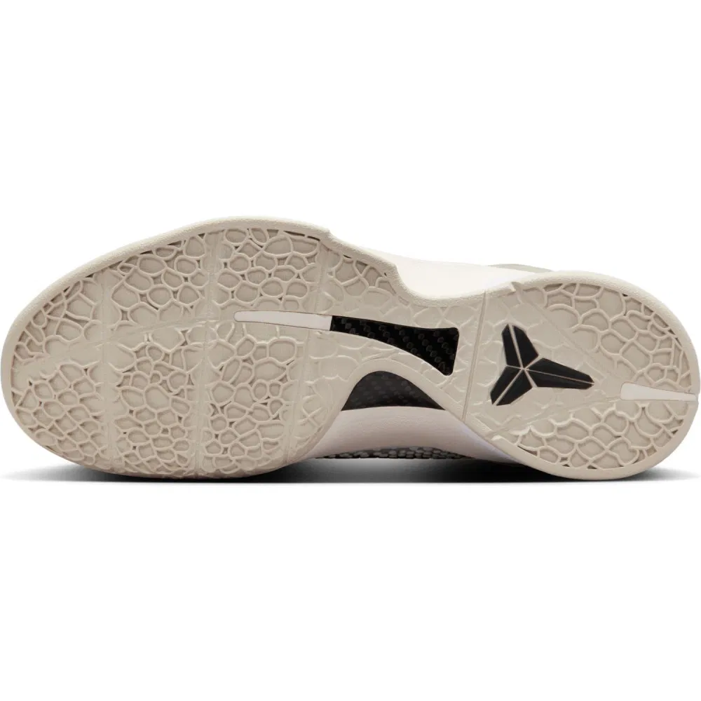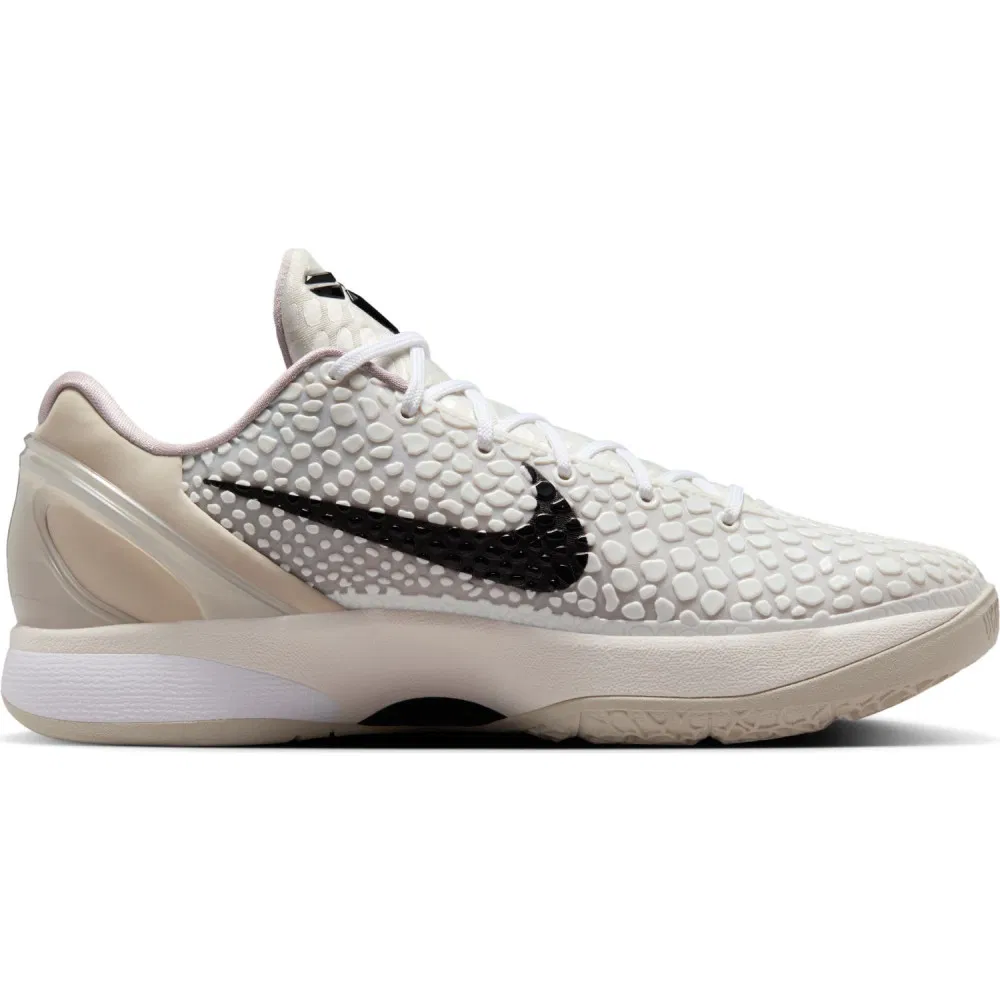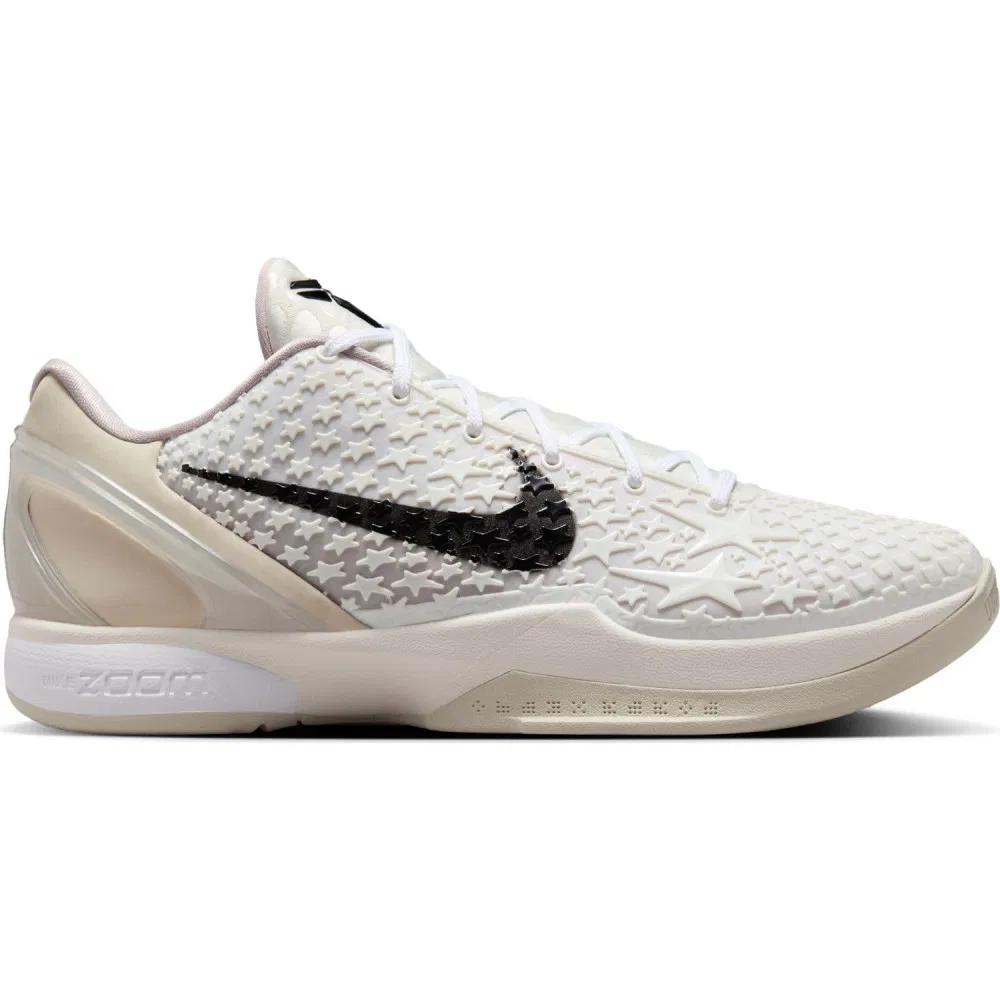 La tige et la semelle sont habillées de différents tons allant du blanc au blanc crémeux, avec le « Swoosh » sur l’empeigne et le logo de Kobe Bryant sur la languette pour seuls contrastes, en noir. On retrouve l’emblématique motif à peau de serpent qui tend vert un revêtement étoilé sur la partie latérale extérieure. On note également la présence d’une cage en TPU pour assurer le maintien au niveau du talon. La semelle offre un alliage de mousse en cushlon sur la partie intermédiaire avec une nité Air Zoom Turbo pour bonifier l’amorti et la réactivité de l’avant du pied.
