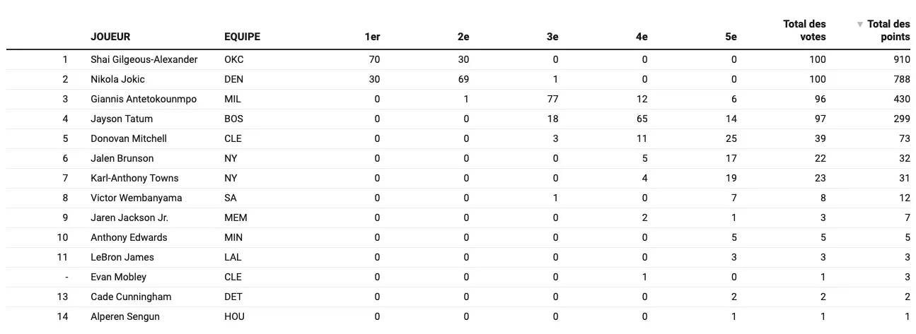 Profitant de la première place bien établie d’Oklahoma City (44 victoires – 10 défaites) dans la conférence Ouest, le Canadien récolte ainsi 70 « première place », contre 30 pour le pivot des Nuggets. On peut dire que c’est désormais quasiment un duel puisque « SGA » et le « Joker » héritent de 199 des 200 première et deuxième places, seul un journaliste ayant opté pour Giannis Antetokounmpo et Nikola Jokic à la 3e place…