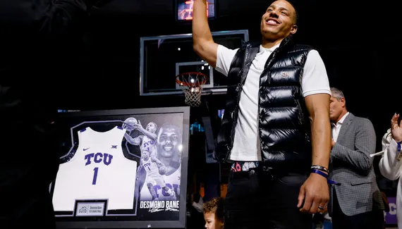La fac de TCU a profité du All-Star Break pour mettre à l'honneur Desmond Bane. À la mi-temps de la rencontre face à Texas Tech, remportée par les Horned Frogs, le maillot #1 de l'arrière a ainsi rejoint le plafond de la salle.