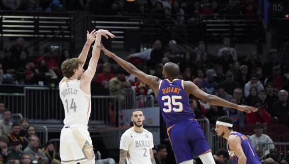 Un dunk en solo en contre-attaque, une attaque de cercle après avoir figé Royce O’Neal grâce à son bras mouliné, un « step-back » à 3-points devant Kevin Durant, puis un second tir primé en « catch-and-shoot ». Tout ça dans les six premières minutes du match face aux Suns. Matas Buzelis était parti sur de très grosses bases dans cette partie.
