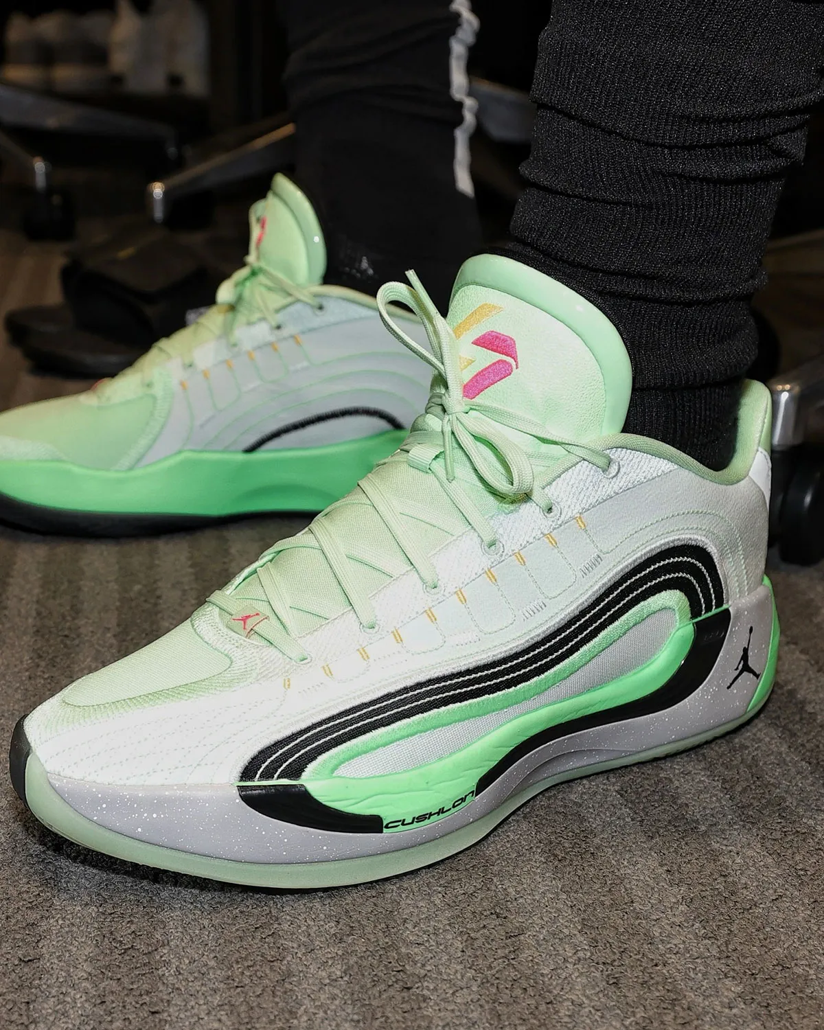 Pour ce premier coloris, la Jordan Luka 4 allie une tige entre blanc, noir et vert fluo avec une semelle intermédiaire en gris clair tacheté de blanc. Des finitions en jaune et rose complètent le tout, pour faire ressortir le logo de Luka Doncic sur la languette ou encore le “Jumpman”.