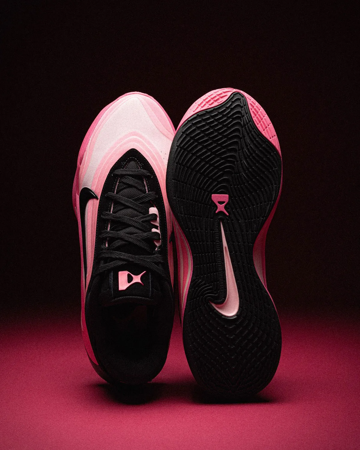Les différentes teintes de rose sont cette fois assorties d”une touche de noir sur la partie supérieure et le talon. On en retrouve également sous la semelle et pour faire ressortir le « Swoosh » présent sur l’empeigne. Le logo de la joueuse des Aces de Las Vegas apparaît en rose sur fond noir sur la languette et sous la semelle.