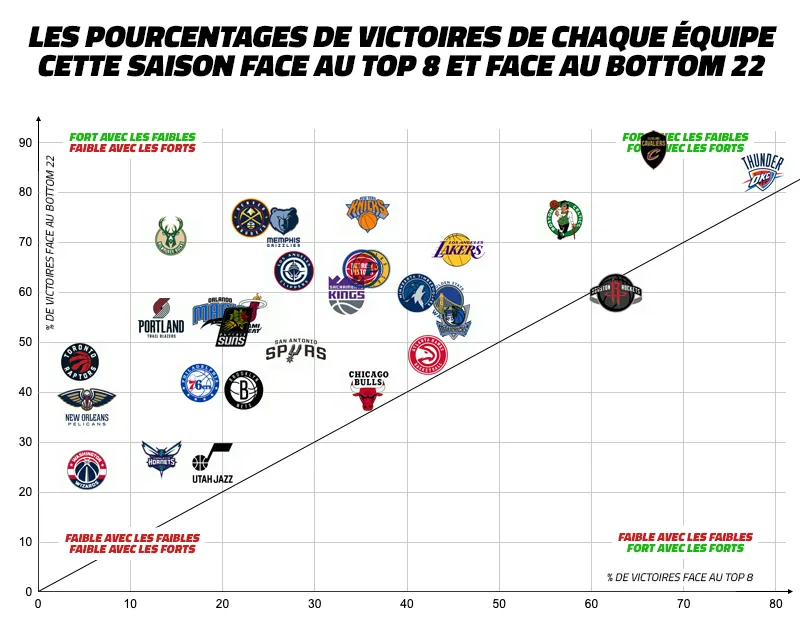 Les % de victoires face au Top 8 (les 8 meilleurs bilans) et face au Bottom 8 (les 22 plus mauvais bilans)