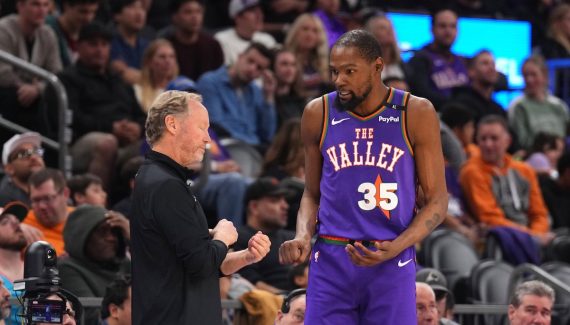 Soirée riche en émotions à Phoenix. Les Suns ont dû signer un improbable comeback face aux Clippers pour l’emporter dans un contexte sportif qui reste très tendu. Tendu comme dans cette scène capturée dans le premier quart-temps entre Kevin Durant et son coach, Mike Budenholzer.