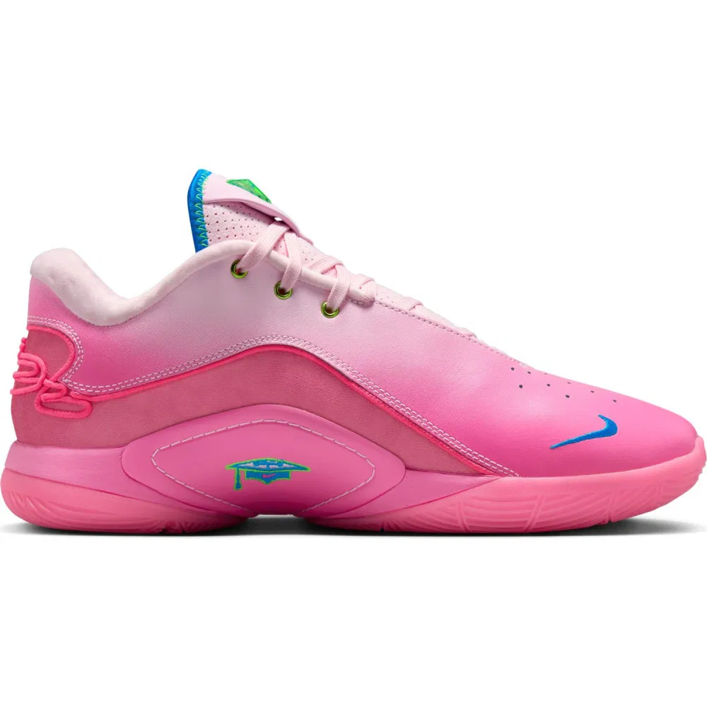 Chaque année, Nike lui concocte donc un coloris « Pink » et voici donc la version de la LeBron 22. Baptisée « I Promise », il se décline dans un dégradé allant du blanc au rose, avec des finitions en vert et bleu. On retrouve également en clin d’œil à l’école de LBJ le motif d’un « mortarboard » au niveau de la semelle.