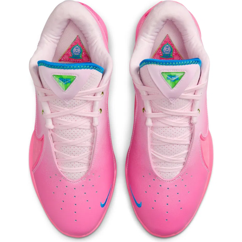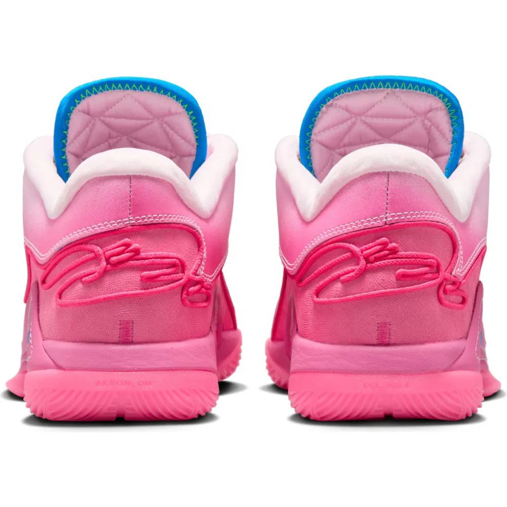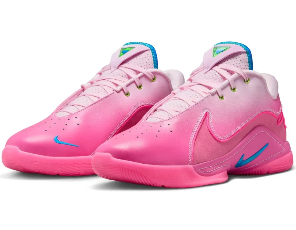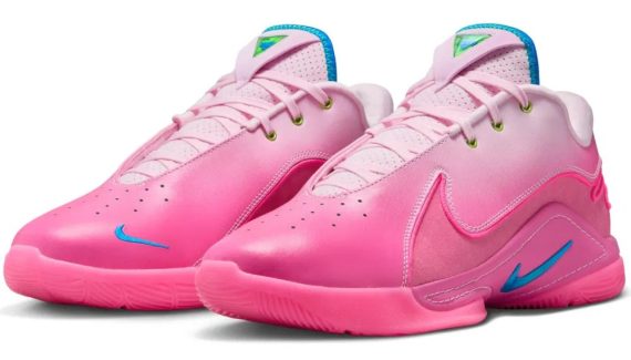 Chaque année, Nike lui concocte donc un coloris « Pink » et voici donc la version de la LeBron 22. Baptisée « I Promise », il se décline dans un dégradé allant du blanc au rose, avec des finitions en vert et bleu. On retrouve également en clin d’œil à l’école de LBJ le motif d’un « mortarboard » au niveau de la semelle.