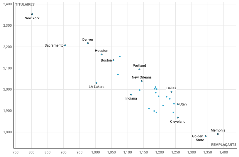 On le sait : les titulaires des Knicks sont ceux qui sont (très largement) le plus sollicités cette année en NBA, avec un total cumulé de 2 353 minutes sur le parquet, contre seulement 802 minutes pour les remplaçants.