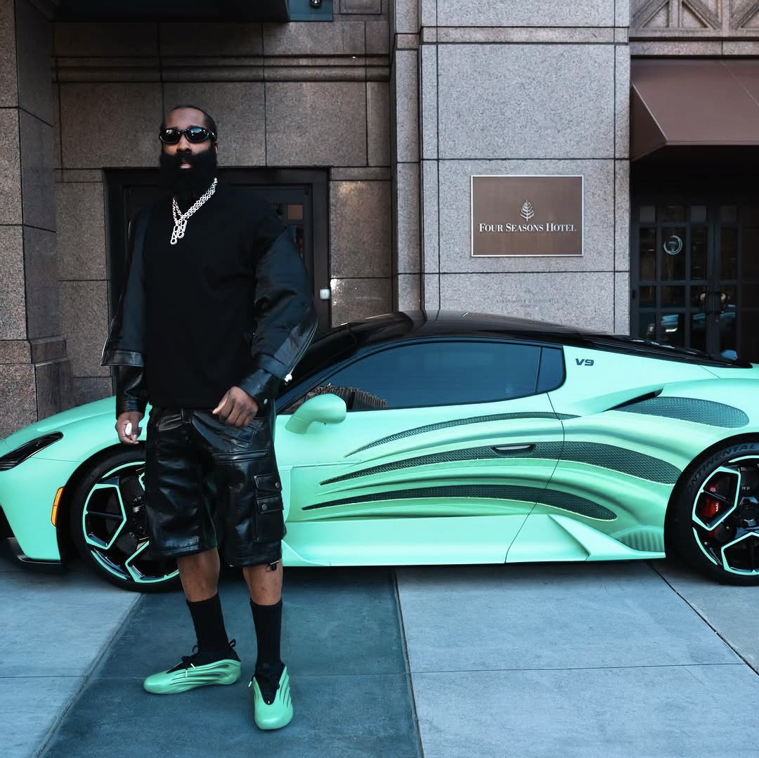 Celui qu’on surnomme « The Beard » s’est en effet présenté avec une Maserati aux couleurs de la dernière version de sa chaussure signature, la Harden Vol. 9 « Metamorphosis » ! La voiture de luxe reprend scrupuleusement le design de la paire, habillée d’une tige verte et trois bandes en noir symbolisant la marque adidas, sur l’empeigne et la base du talon. Deux autres teintes de vert complètent le dispositif au niveau de la semelle extérieure.
