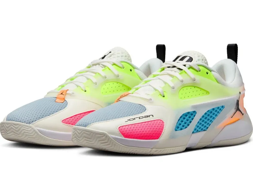 Disponible en France depuis fin octobre, la Jordan Heir en est à présent à huit coloris dont deux petits nouveaux récemment ajoutés à la collection. On retrouve d’abord une version « Abundance », proche de la « Showstopper » en blanc et deux teintes de vert, et une autre plus colorée baptisée « Cutting Twine » mêlant rose, vert fluo, bleu, orange, blanc et noir.